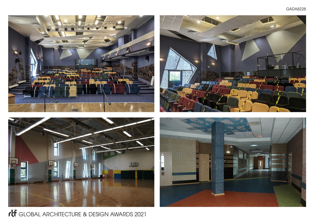 The building is equipped with modern alarm, fire extinguishing, ventilation and heating systems. The building of the block of primary classes is also adapted for students of children with disabilities: there are ramps for passage in wheelchairs, an elevator with a carrying capacity of 1,000 kg, wide aisles. During the construction, the most modern building materials and technologies were used: a system of ventilated facades with the use of porcelain stoneware and facade aluminum panels. The building has been assigned the highest energy efficiency class “B +”. On the territory of the educational institution, a complex of landscaping works has been completed. In front of the main entrance there is a platform for holding social and cultural events; equipped with pedestrian paths, etc. Landscaping works have been carried out on the territory of the object, flower beds have been arranged.