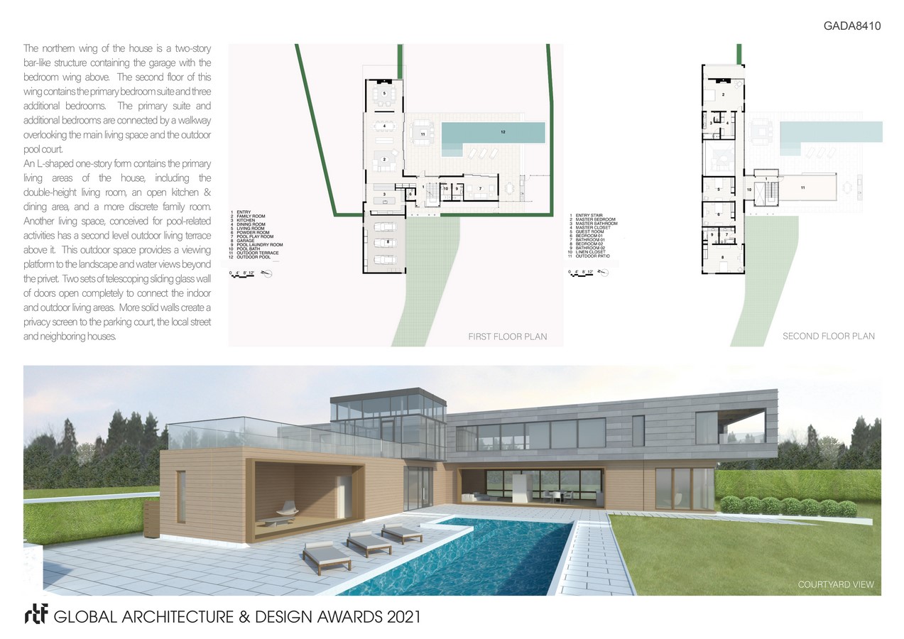 Because the house will function as a weekend and summer residence for a NYC-based multi-generational family, the commodious outdoor living area consists of a large food-prep and dining area, an L-shaped swimming pool and a hard-scaped area for group activities and lounging. The variety of living areas, both indoor and outdoor, comfortably accommodate an extended family with plentiful options for communal and individual activities alike. The second floor arrival and outdoor living spaces provide connection to the ocean-side environment just beyond the walls of the property.