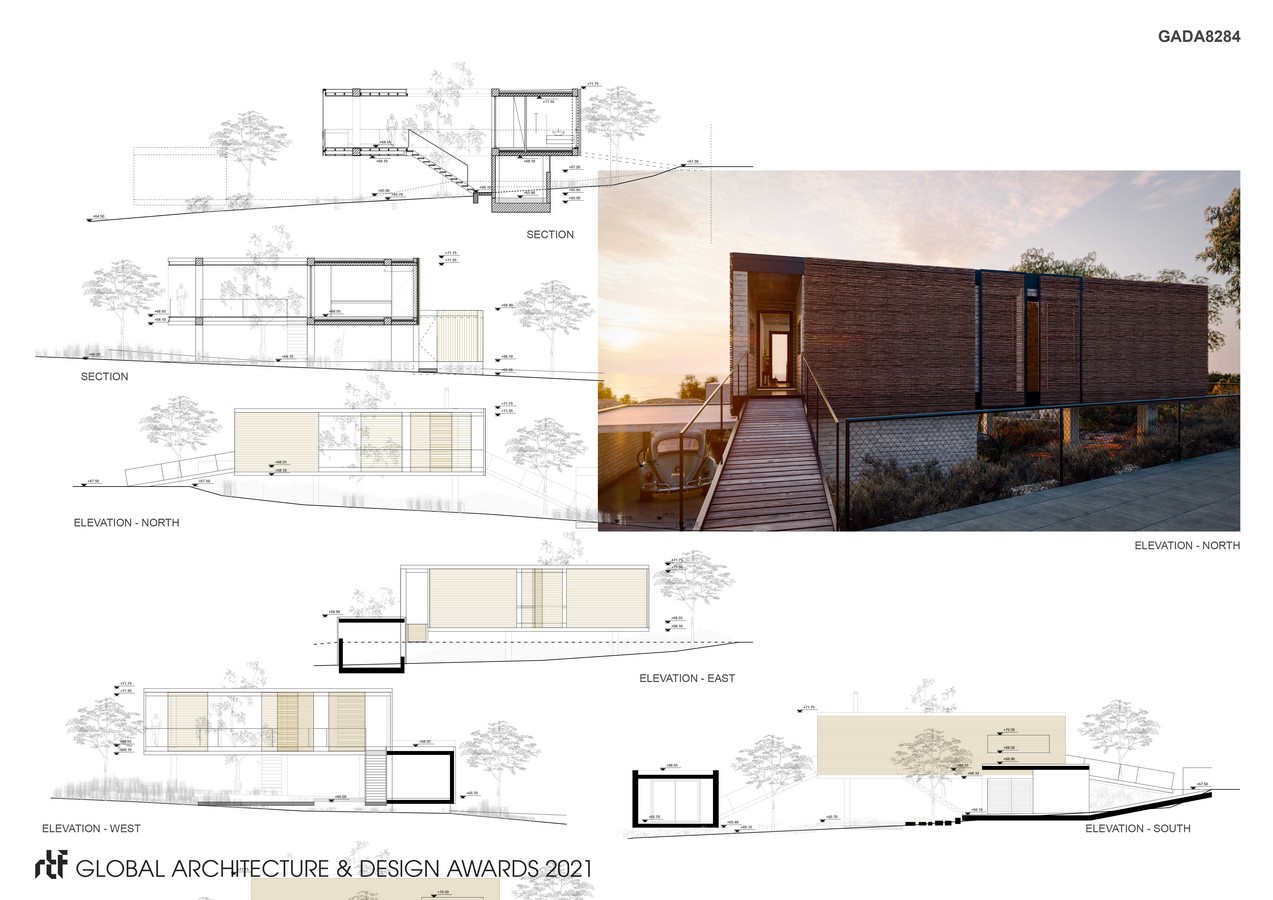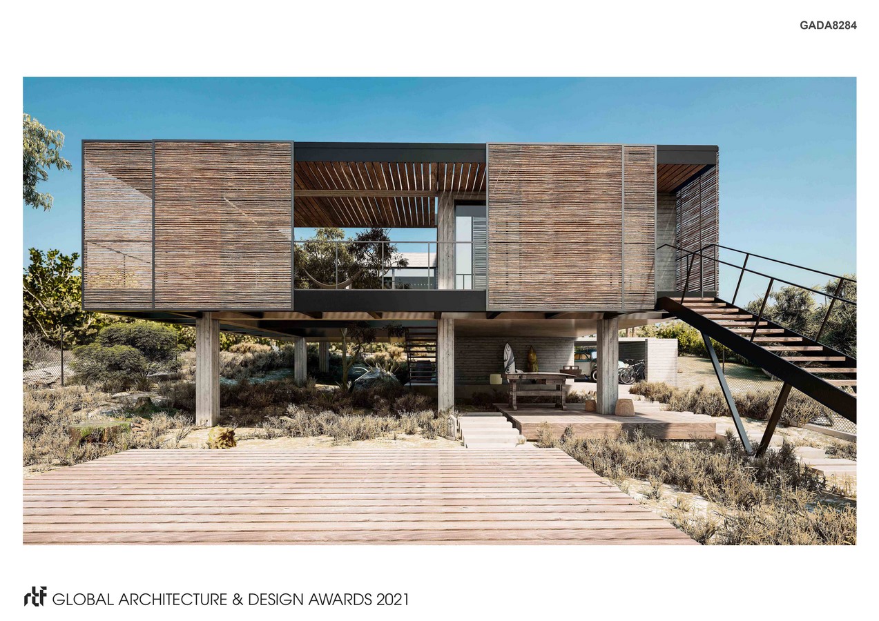 A centered void visually and functionally connects the 1st floor’s closed spaces and verandas with the shaded natural ground of the “pilotis” where the surfer spends his time in an outdoor workshop.