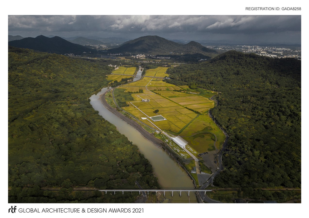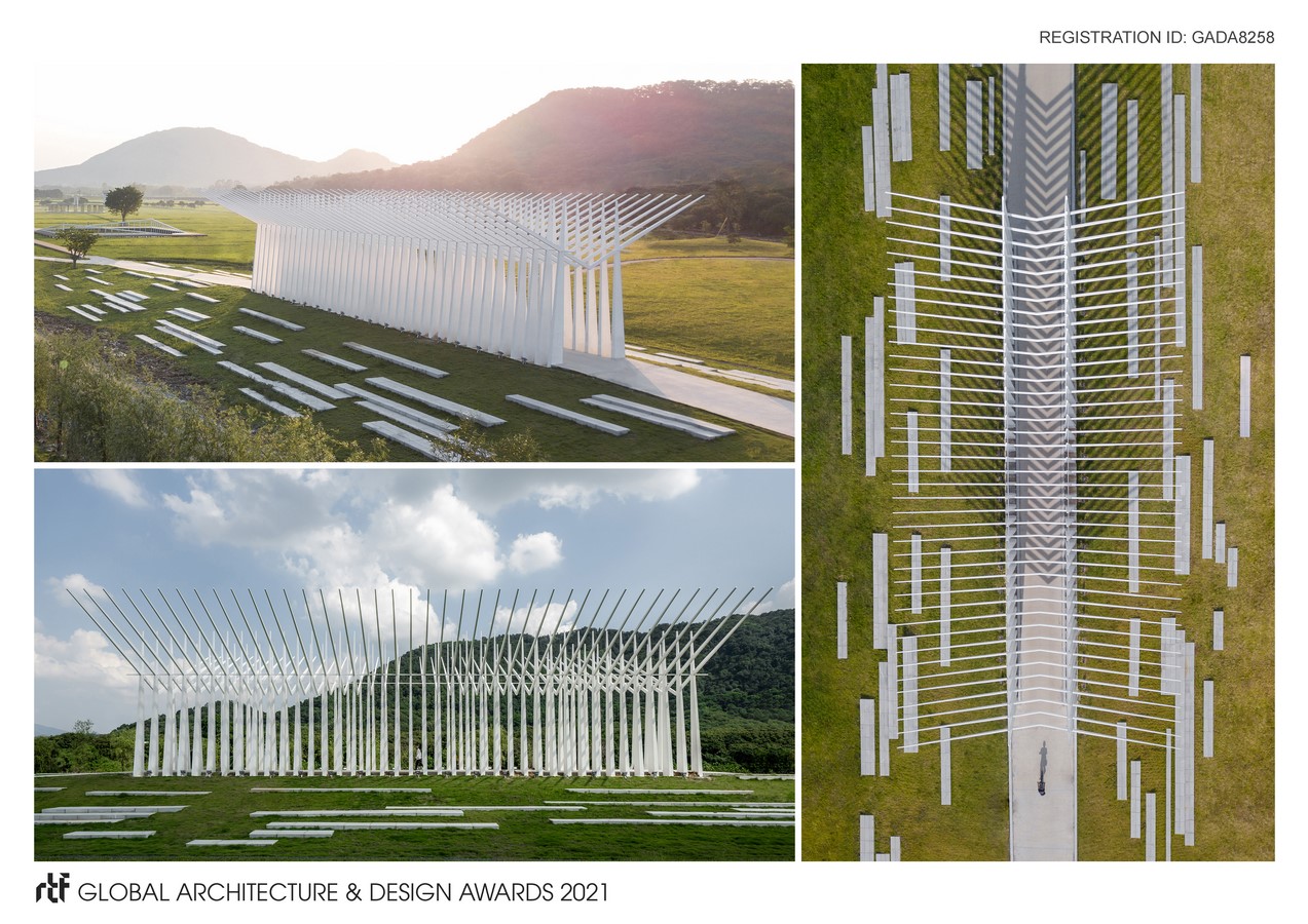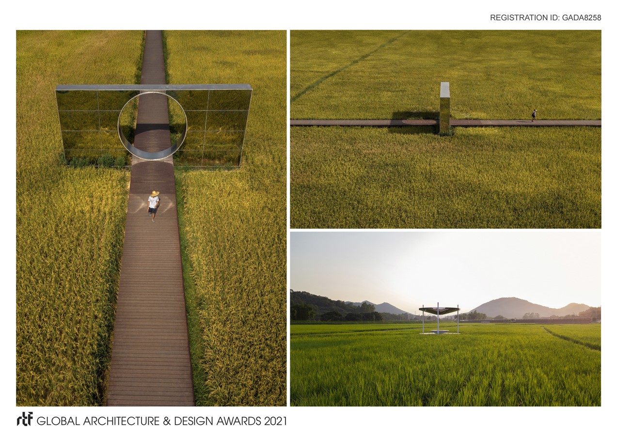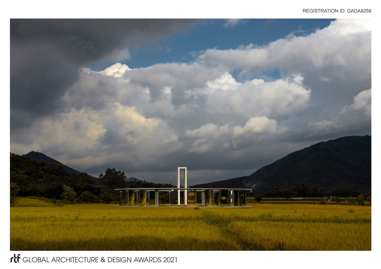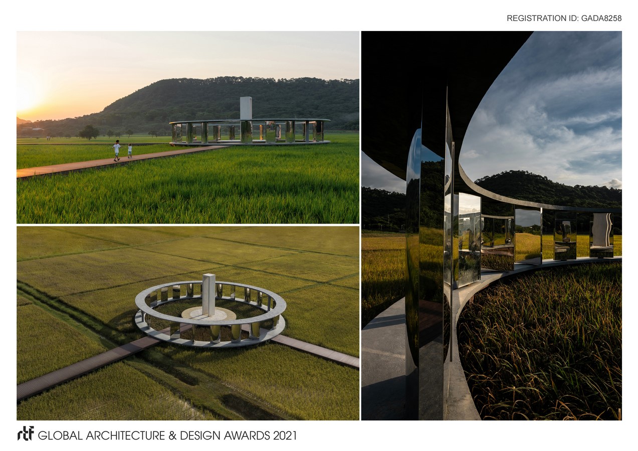 The project is located in the suburb of Guangzhou, China. As the demonstration pilot of future agriculture technologies, 6 futuristic landscape architectures were placed onto the field, as well as the key nodes of the main tour route. The series of constructions not only echo the geometry in the farm but also embody the function of visiting and resting sites. These constructions reflect imagination about technology, the future, and the unknown.