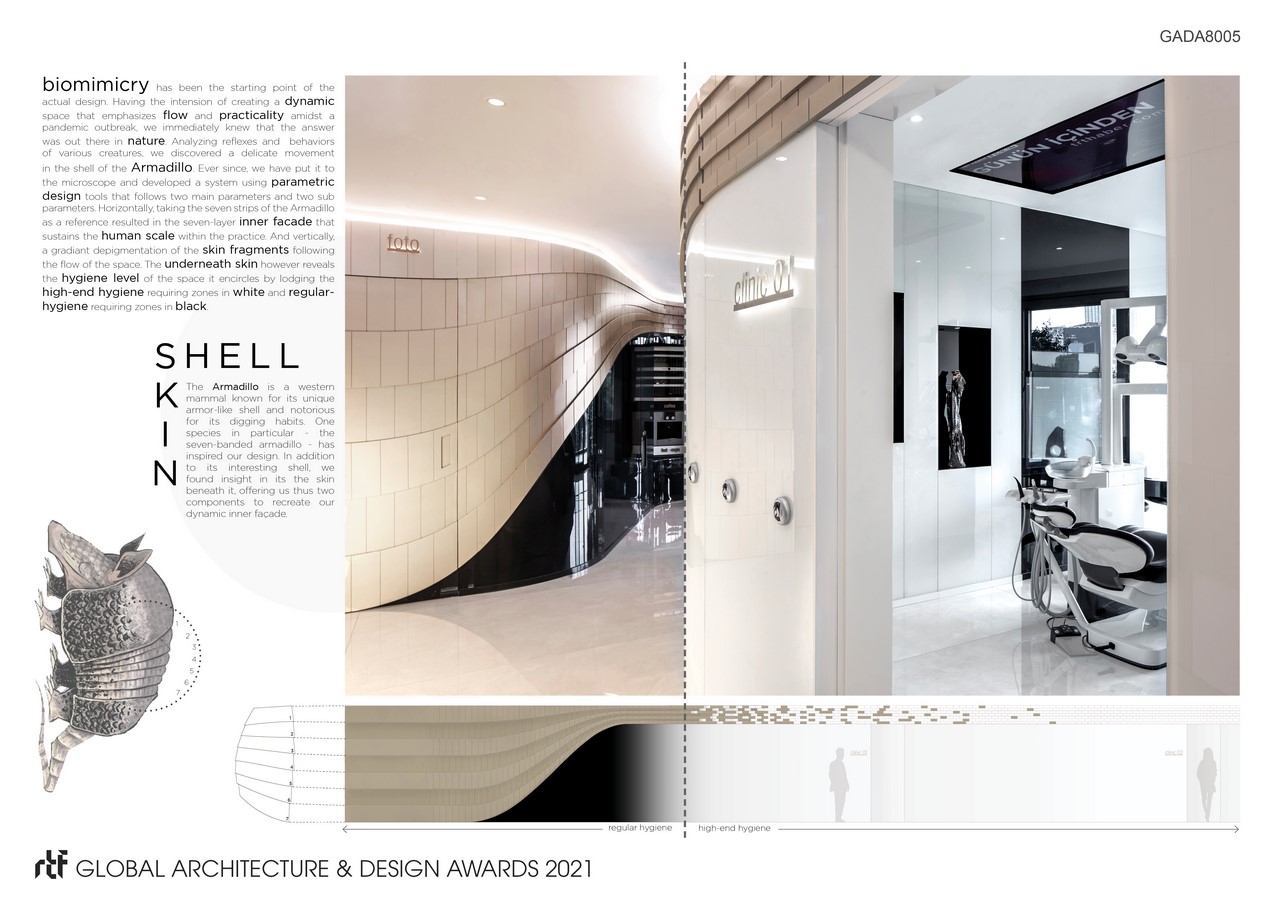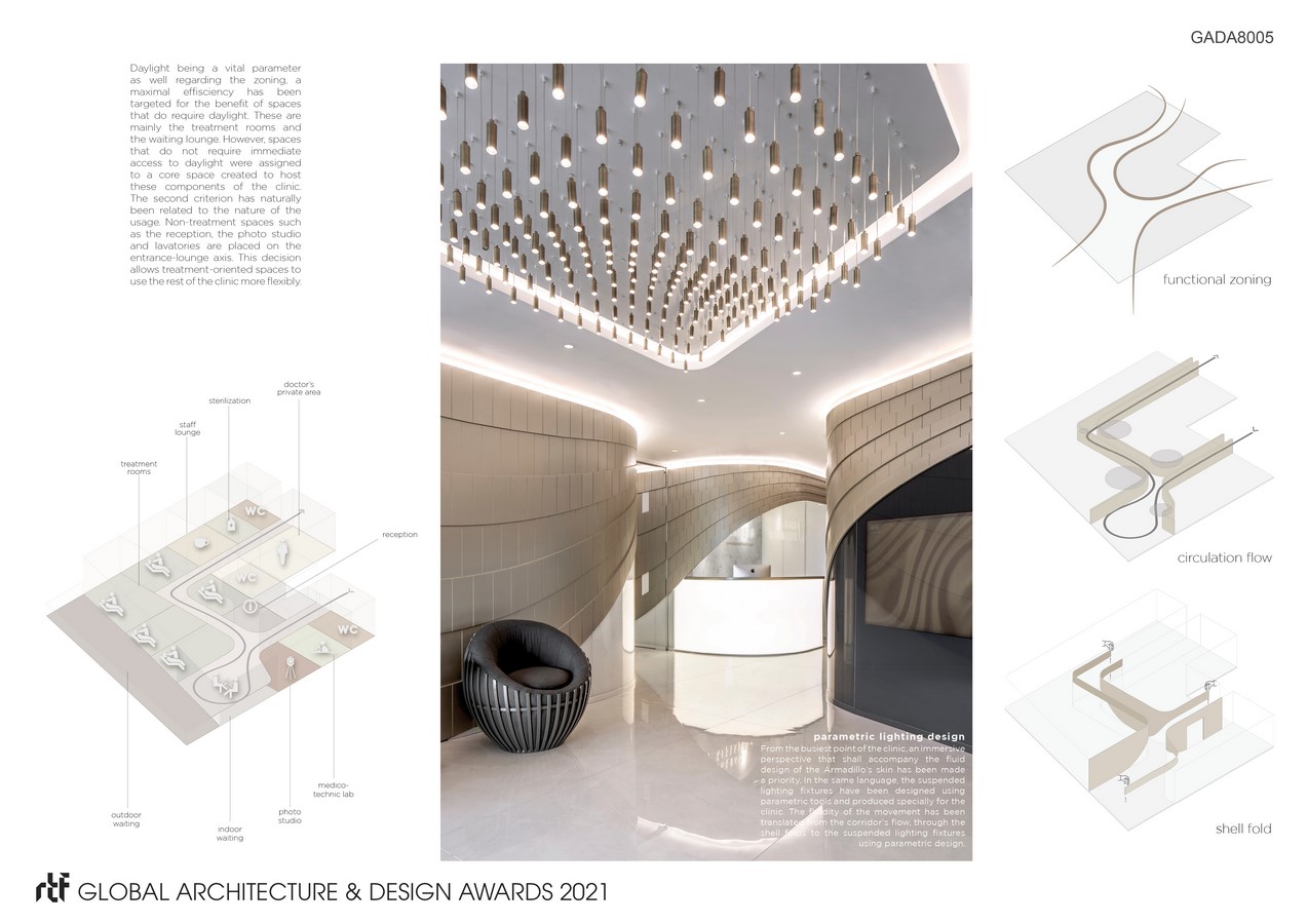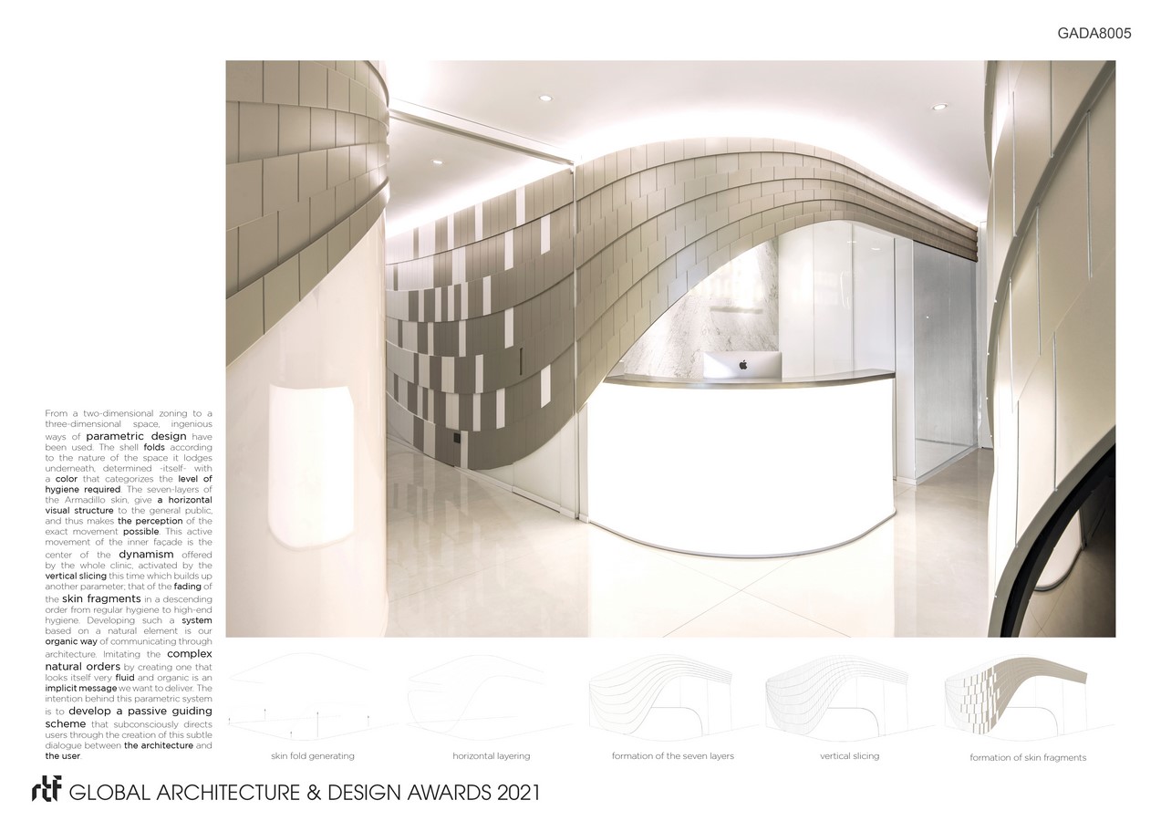 With this approach in mind, the focus was on the sensation of flow and thus the location of the spaces in a composition that provides a proper circulation. The tectonics of the interior architecture are additionally shaped by the organic nature of the idea of flow. As for the plasticity of the clinic, it is derived from the inner facade, which folds and flows according to function. The nature’s mathematical response to this folding system has been the greatest reference. This biomimicry process mainly landed on the armadillo’s mechanical folding parameters. Considering the characteristics of the animal, we have mostly examined its organic folds, stretches and openings. On another note, the metallic color and texture of this skin intends to highlight the man-made nature of this element as well as the technologic orientation of the clinic.