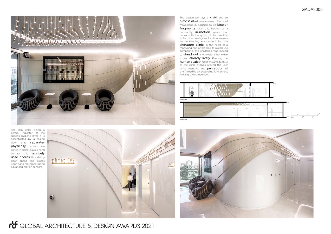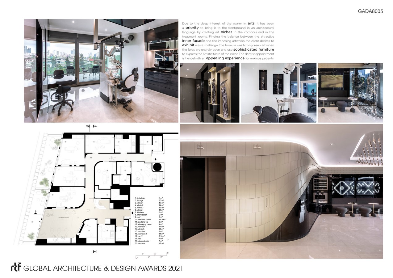 The human scale is the primary reference taken while creating an interior attitude entirely shaped by natural codes and references. Contemporary design technologies emphasized the importance of art and technology omnipresent in the overall space. Architecturally, the spatial design and the zoning of the interior are shaped by parametric tools and methods. Having two office plots affiliated, the architects were bound to generate a five-treatment-room dental clinic in 250 sqm for an internationally renowned dentist.