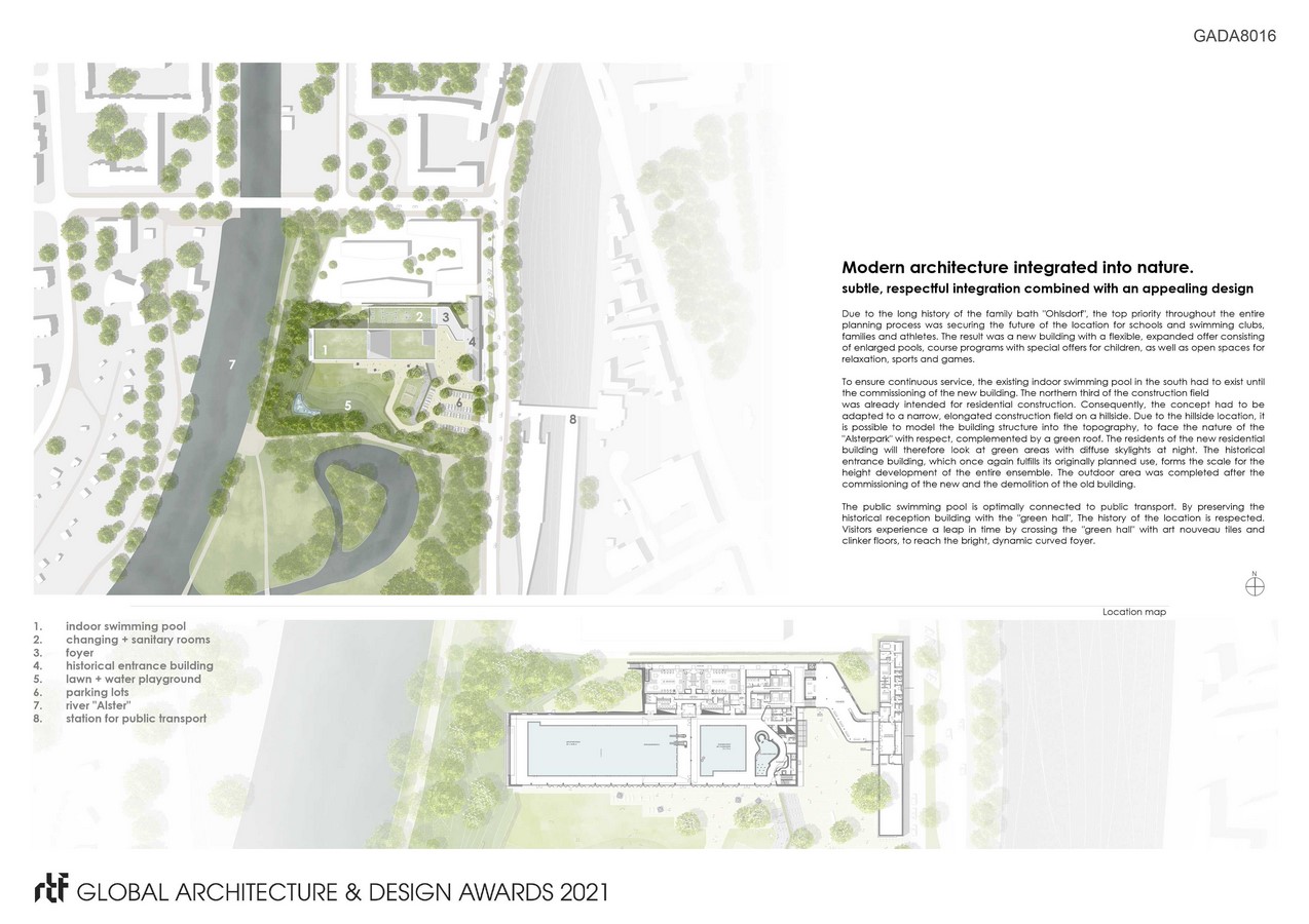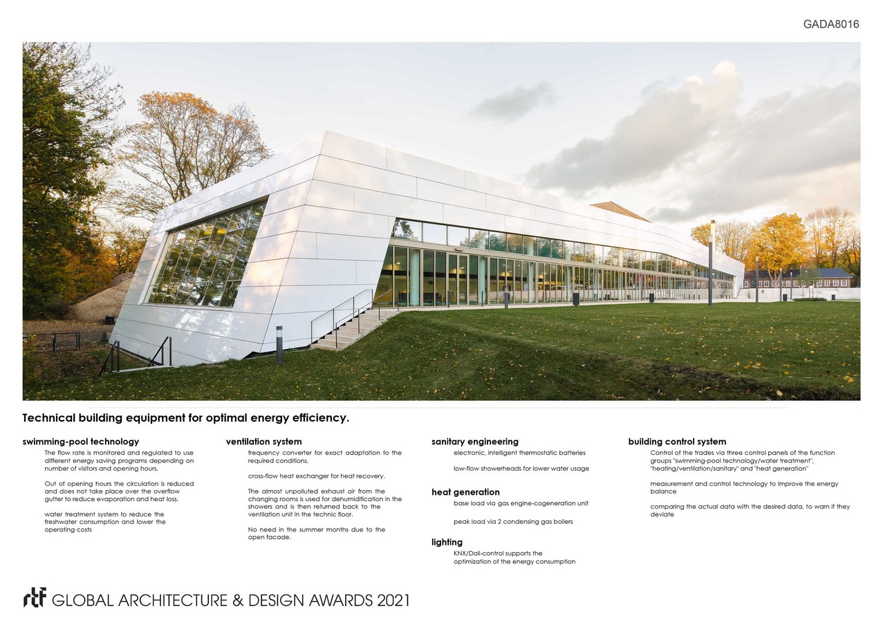 The climate-friendly family bath respects and integrates the history of the location and expands it with a modern architectural language as well as a wide range of offers for visitors. The attractive nature of the „Alsterpark“ merges with the embedded building, whereby the site-specific building design enriches the environment. The consideration of sustainability and energy efficiency in the technical building equipment reflects conscious planning and emphasizes the connection to nature.