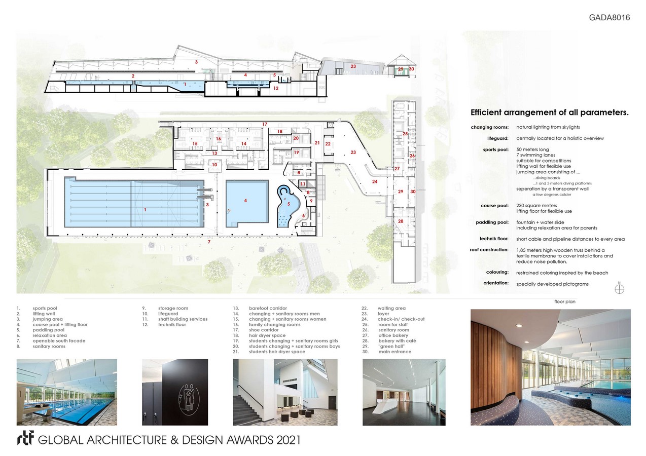 The foyer docking onto the historic entrance leads to the lower level, where the changing rooms are located. From this point, the 90m long indoor swimming hall with three pools divided into two sub-areas can be accessed. Thanks to the separation by a transparent wall, the area of the sports pool can be kept a few degrees colder than the swimming course and children’s area.