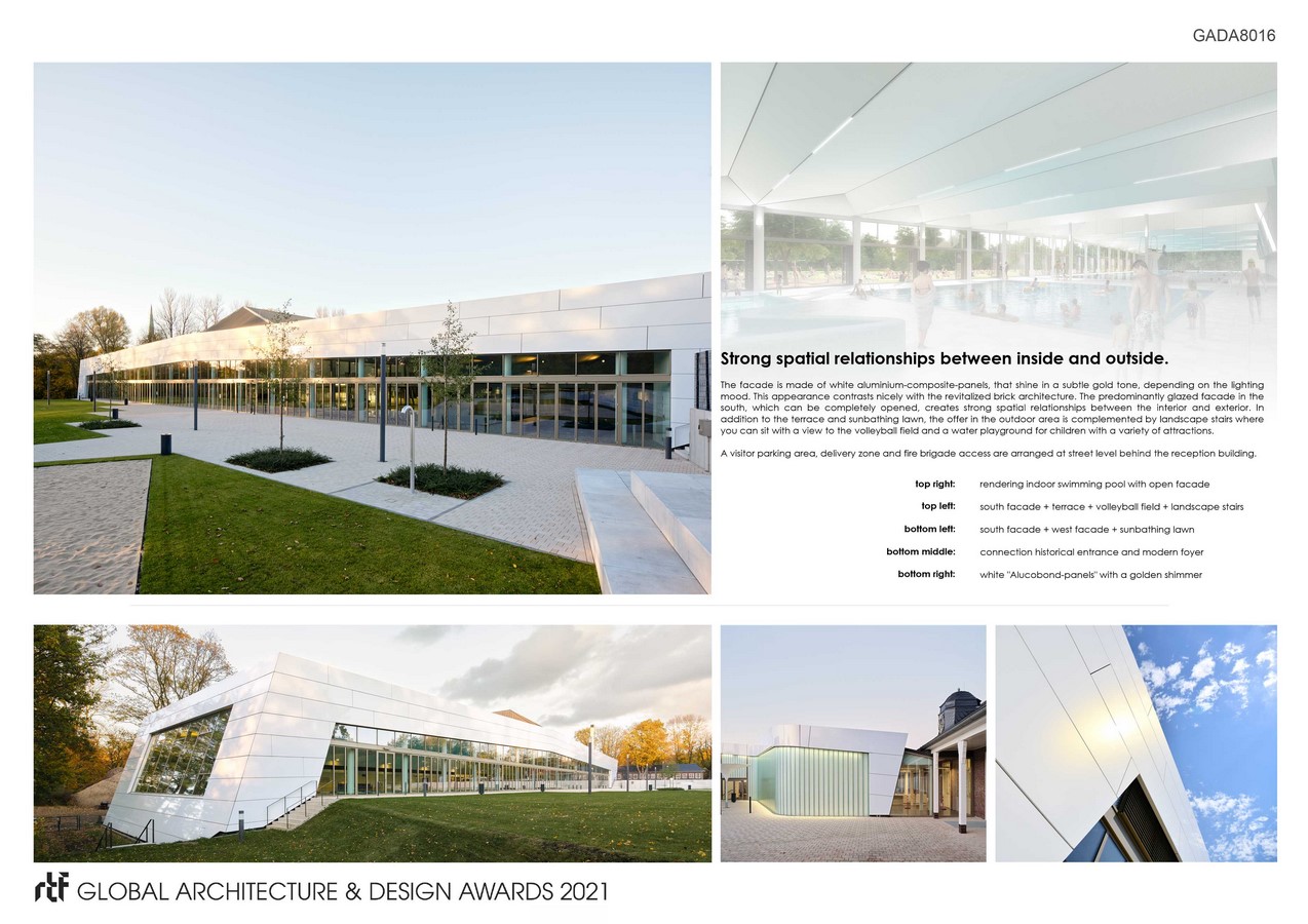 The facade is made of white aluminium-composite-panels that shine in a subtle gold tone, depending on the lighting mood. This appearance contrasts nicely with the revitalized brick architecture. The roof construction is made of 1.85 meters high wooden truss behind a textile membrane to cover installations and reduce noise pollution. In the area of the diving towers a steel framework is added to the construction.