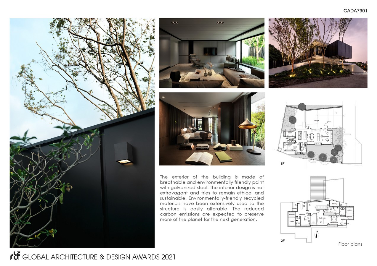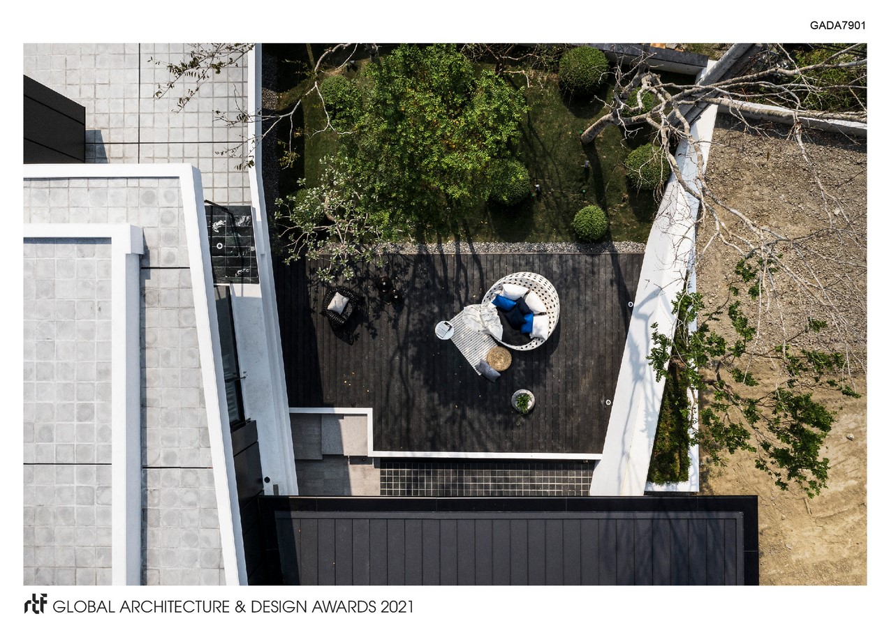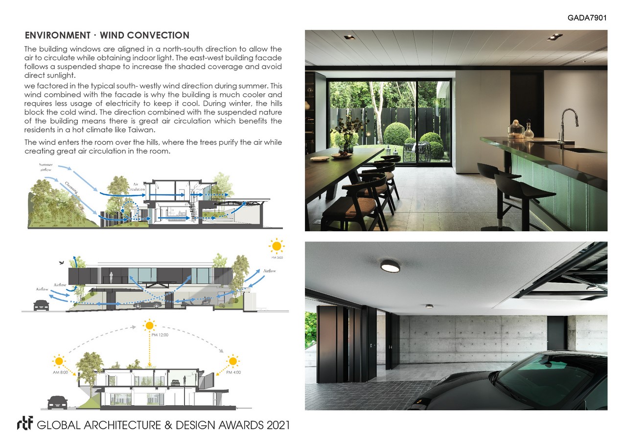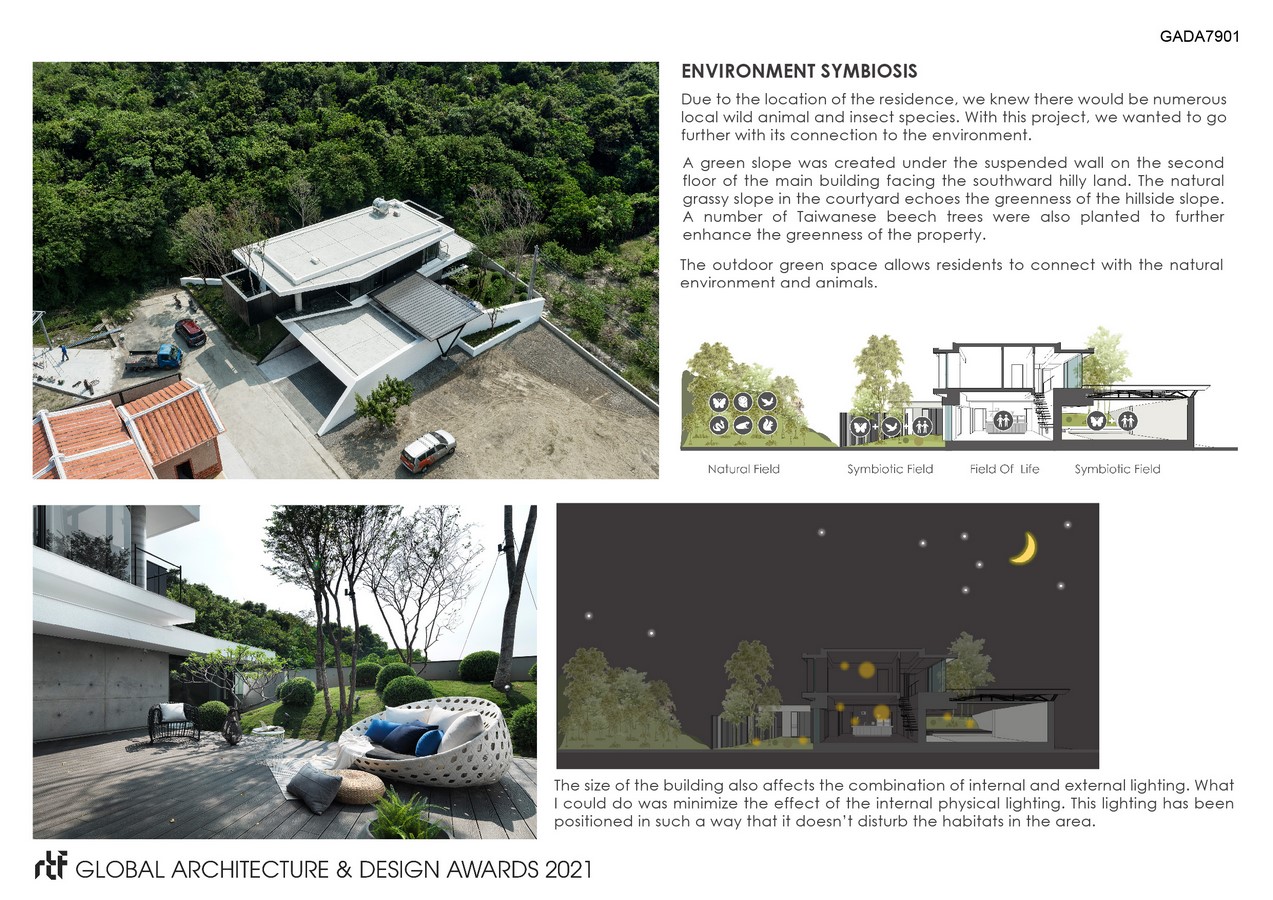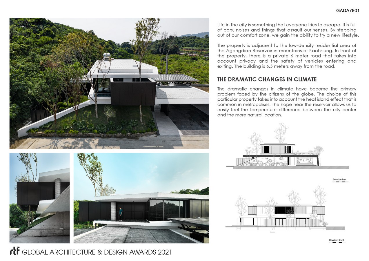 Life in the city is something that everyone tries to escape. It is full of cars, noises and things that assault our senses. By stepping out of our comfort zone, we gain the ability to try a new lifestyle. The property is adjacent to the low-density residential area of the Agongdian Reservoir in mountains of Kaohsiung. In front of the property, there is a private 6 meter road that takes into account privacy and the safety of vehicles entering and exiting. The building is 6.5 meters away from the road. A green slope was created under the suspended wall on the second floor of the main building facing the southward hilly land. The natural grassy slope in the courtyard echoes the greenness of the hillside slope.