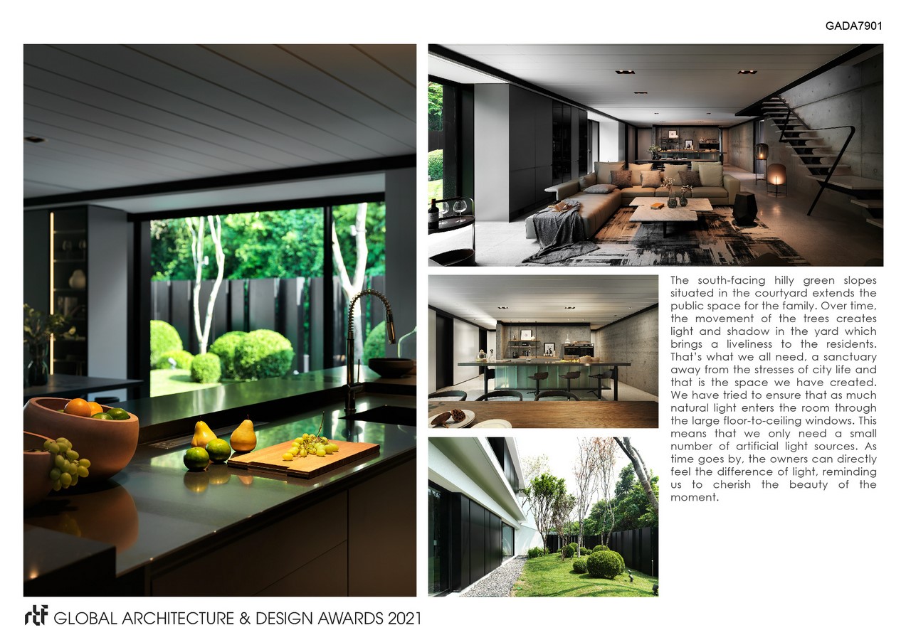 A large number of green trees around the building take into the location of the property and attempt to address carbon neutrality. At the same time, this manages to create shade and filter the ambient air quality. The living room has always been the focus of family. By significantly reducing the cost of construction we managed to focus more resources on the spaces inside. The south-facing hilly green slopes situated in the courtyard extends the public space for the family. Over time, the movement of the trees creates light and shadow in the yard which brings a liveliness to the residents. As time goes by, the owners can directly feel the difference of light, reminding us to cherish the beauty of the moment.