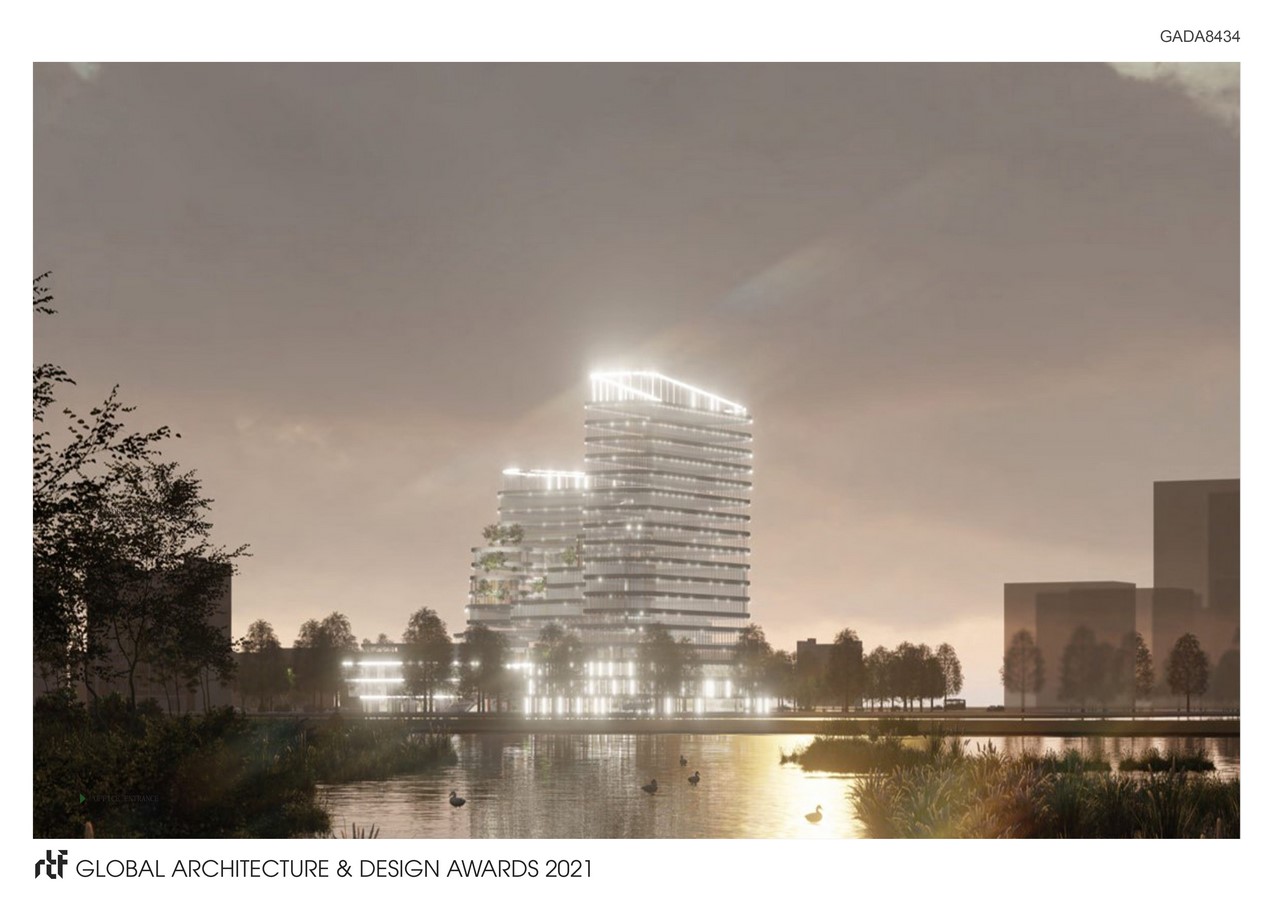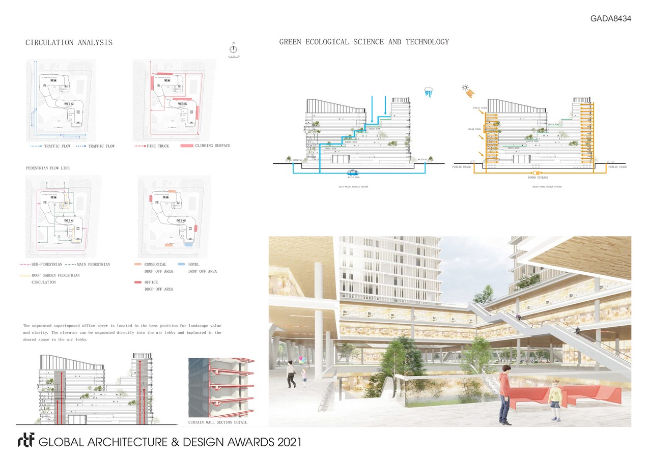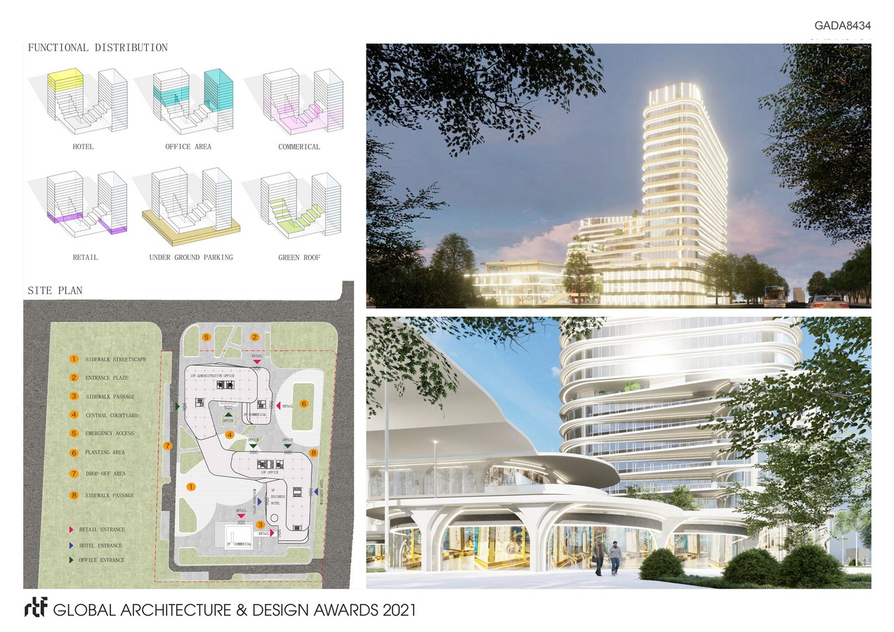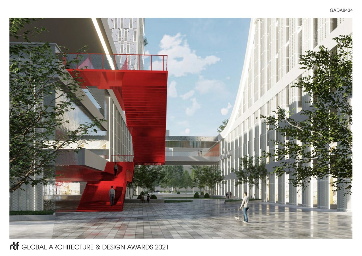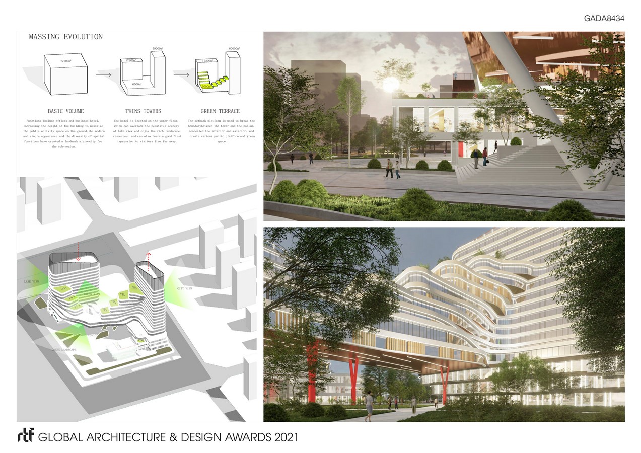 The design concept of “CLOUD LADDERING”. The twin towers carry the main functions, including office, multi-function services, hotels and small business facilities. Retails and commercials are mainly at podium. The large terraces and setbacks design provides the cityโs public activity space and offer a wealth of surrounding citizens.