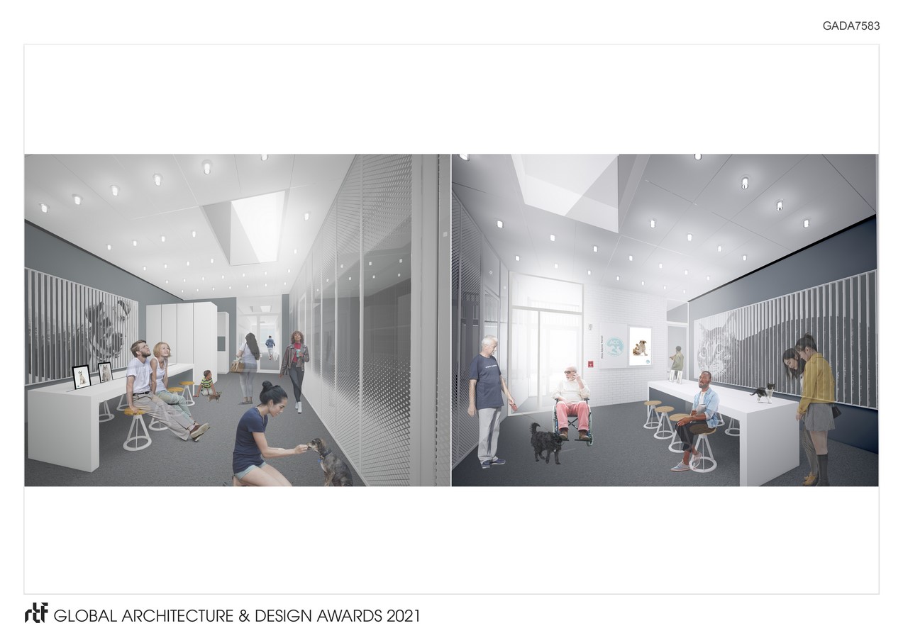 The interior design is based on animal safety/best practices though the design intention varies strategically from standard models for pet adoption facilities. We provide a large welcome area for community gatherings where staff sit together with adoptive families at a shared table.