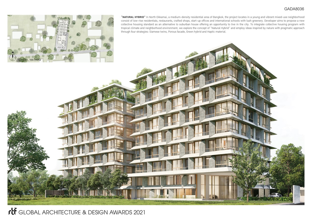 In North Ekkamai, a medium-density residential area of Bangkok, the project locates in a young and vibrant mixed-use neighborhood consist of low-rise residentials, restaurants, crafted shops, start-up offices and international schools with lush greenery. Developer aims to propose a new collective housing standard as an alternative to suburban house offering an opportunity to live in the city. To integrate collective housing program with tropical climate and neighborhood environment, we explore the concept of “Natural Hybrid” and employ ideas inspired by nature with pragmatic approach through four strategies: Siamese twins, Porous façade, Green hybrid and Haptic material.