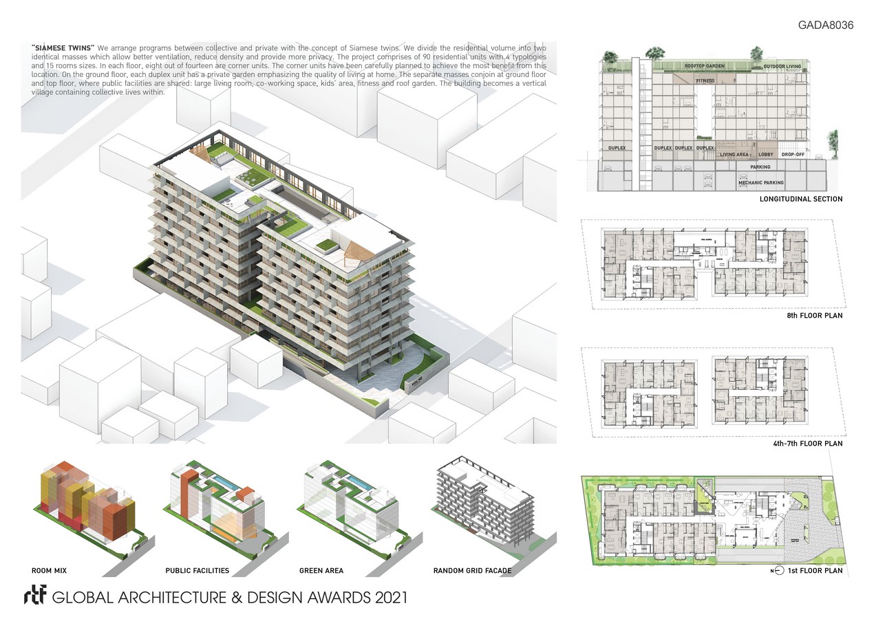 We arrange programs between collective and private with the concept of Siamese twins. We divide the residential volume into two identical masses which allow better ventilation, reduce density and provide more privacy. The project comprises of 90 residential units with 4 typologies and 15 rooms sizes. In each floor, eight out of fourteen are corner units. The corner units have been carefully planned to achieve the most benefit from this location. On the ground floor, each duplex unit has a private garden emphasizing the quality of living at home. The separate masses conjoin at ground floor and top floor, where public facilities are shared: large living room, co-working space, kids’ area, fitness and roof garden. The building becomes a vertical village containing collective lives within.