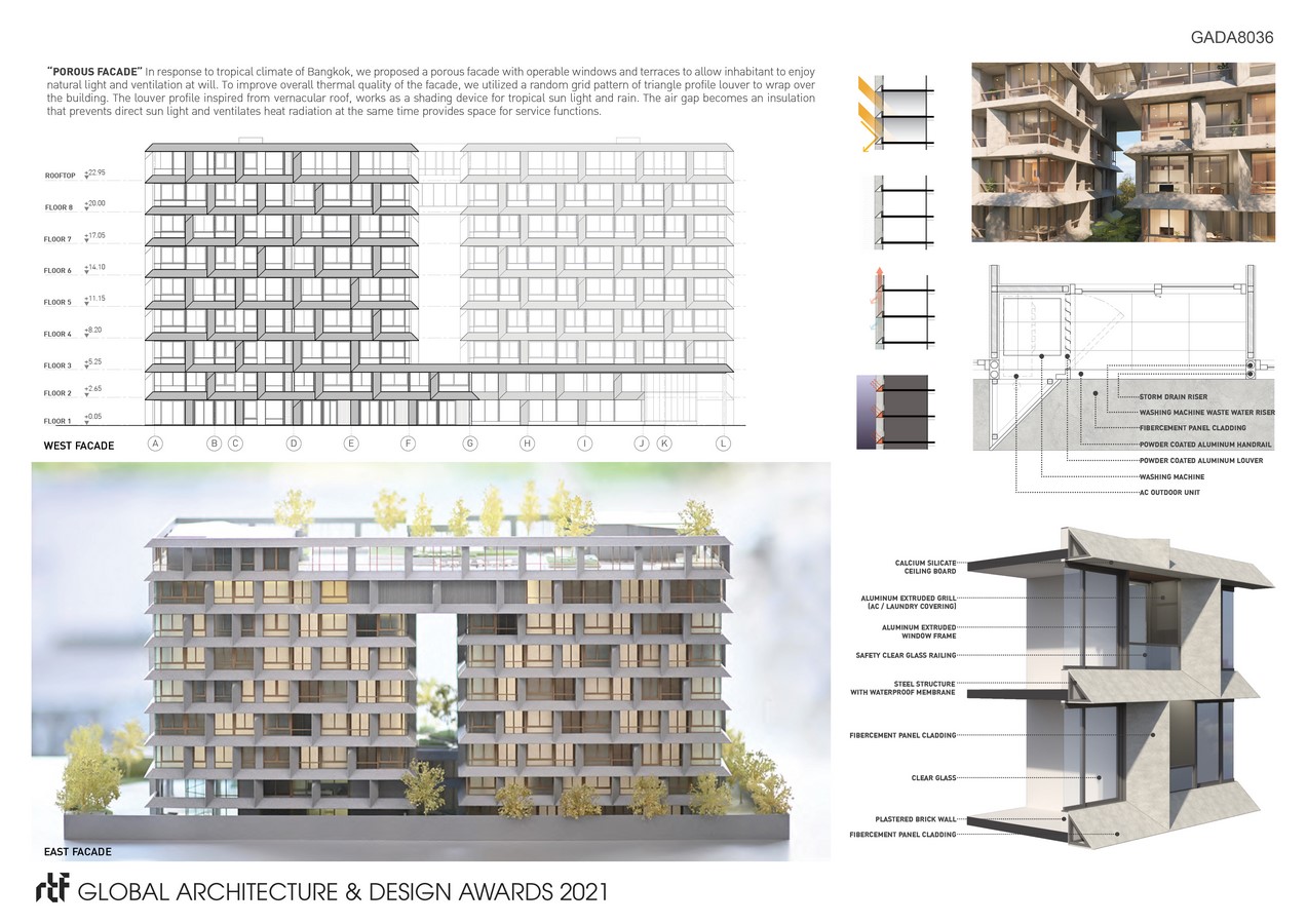 In response to tropical climate of Bangkok, we proposed a porous facade with operable windows and terraces to allow inhabitant to enjoy natural light and ventilation at will. To improve overall thermal quality of the facade, we utilized a random grid pattern of triangle profile louver to wrap over the building. The louver profile inspired from vernacular roof, works as a shading device for tropical sun light and rain. The air gap becomes an insulation that prevents direct sun light and ventilates heat radiation at the same time provides space for service functions.
