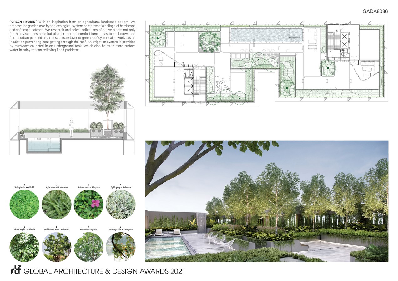With an inspiration from an agricultural landscape pattern, we propose the garden as a hybrid ecological system comprise of a collage of hardscape and softscape patches. We research and select collections of native plants not only for their visual aesthetic but also for thermal comfort function as to cool down and filtrate urban polluted air. The substrate layer of green roof system also works as an insulation preventing heat getting through the roof. An irrigation system is provided by rainwater collected in an underground tank, which also helps to store surface water in rainy season relieving flood problems.