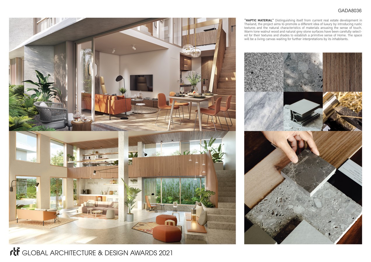 Distinguishing itself from current real estate development in Thailand, the project aims to promote a different idea of luxury by introducing rustic textures and the natural characteristics of materials arousing the sense of touch. Warm tone walnut wood and natural grey stone surfaces have been carefully selected for their textures and shades to establish a primitive sense of Home. The space will be a living canvas waiting for further interpretations by its inhabitants.