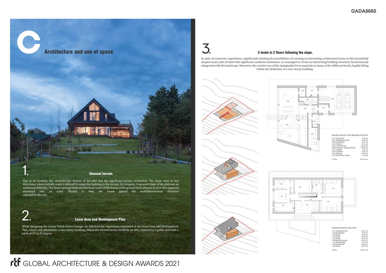 While designing the house, we followed the regulations stipulated in the Local Area and Development Plan, which only allowed for a single floor house with a gable attic. In spite of restrictive regulations, we managed to create an interesting structure of the building. We used the topography of a scenic plot of land creatively and we separated as many as five different levels, legally falling within the definition of a two-storey building.