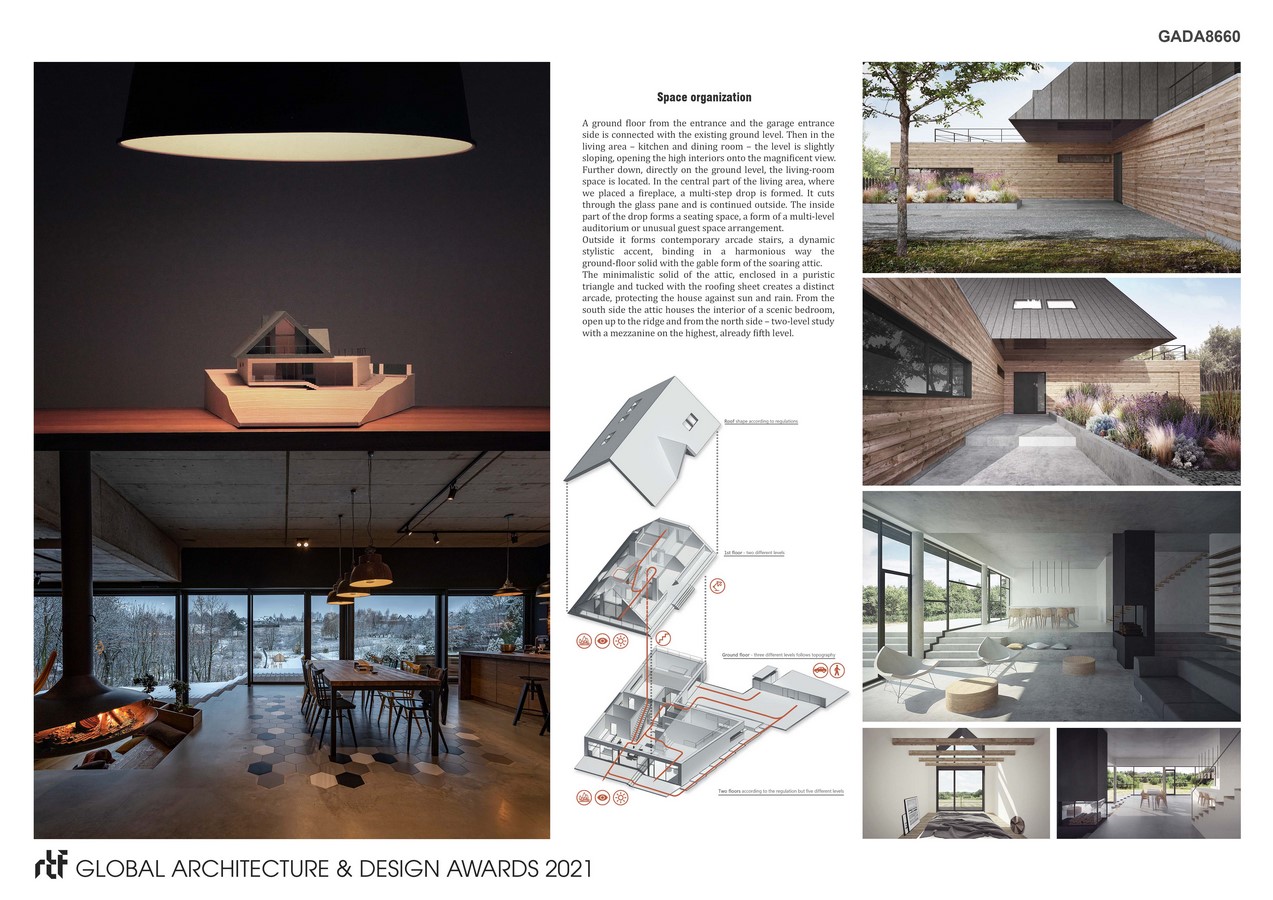 The minimalistic solid of the attic, enclosed in a puristic triangle and tucked with the roofing sheet creates a distinct arcade, protecting the house against sun and rain. From the south side the attic houses the interior of a scenic bedroom, open up to the ridge and from the north side – two-level study with a mezzanine on the highest, already fifth level.