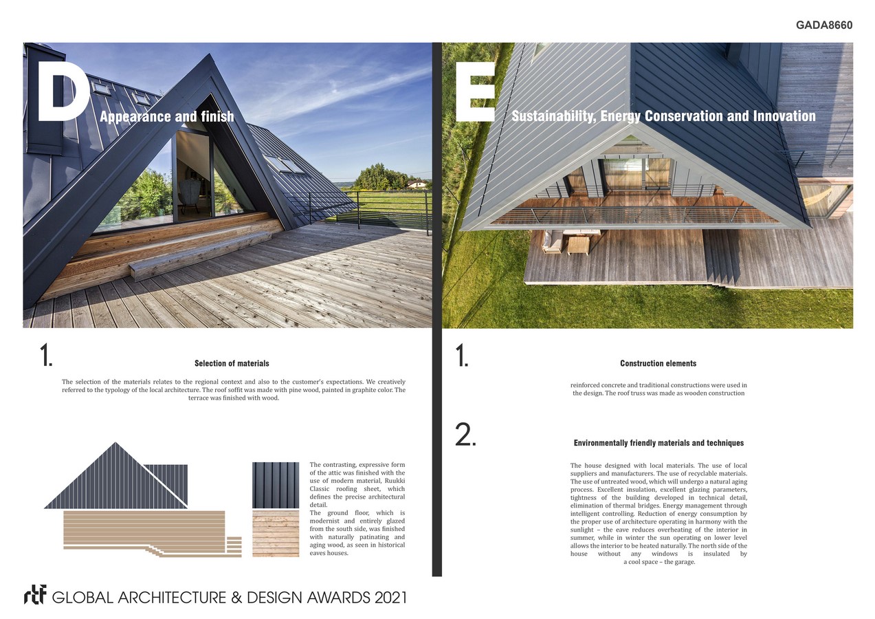 The ground floor, which is modernist and entirely glazed from the south side, was finished with naturally patinating and aging wood, as seen in historical eaves houses. The contrasting, expressive form of the attic was finished with the use of modern material, Ruukki Classic roofing sheet, which defines the precise architectural detail.