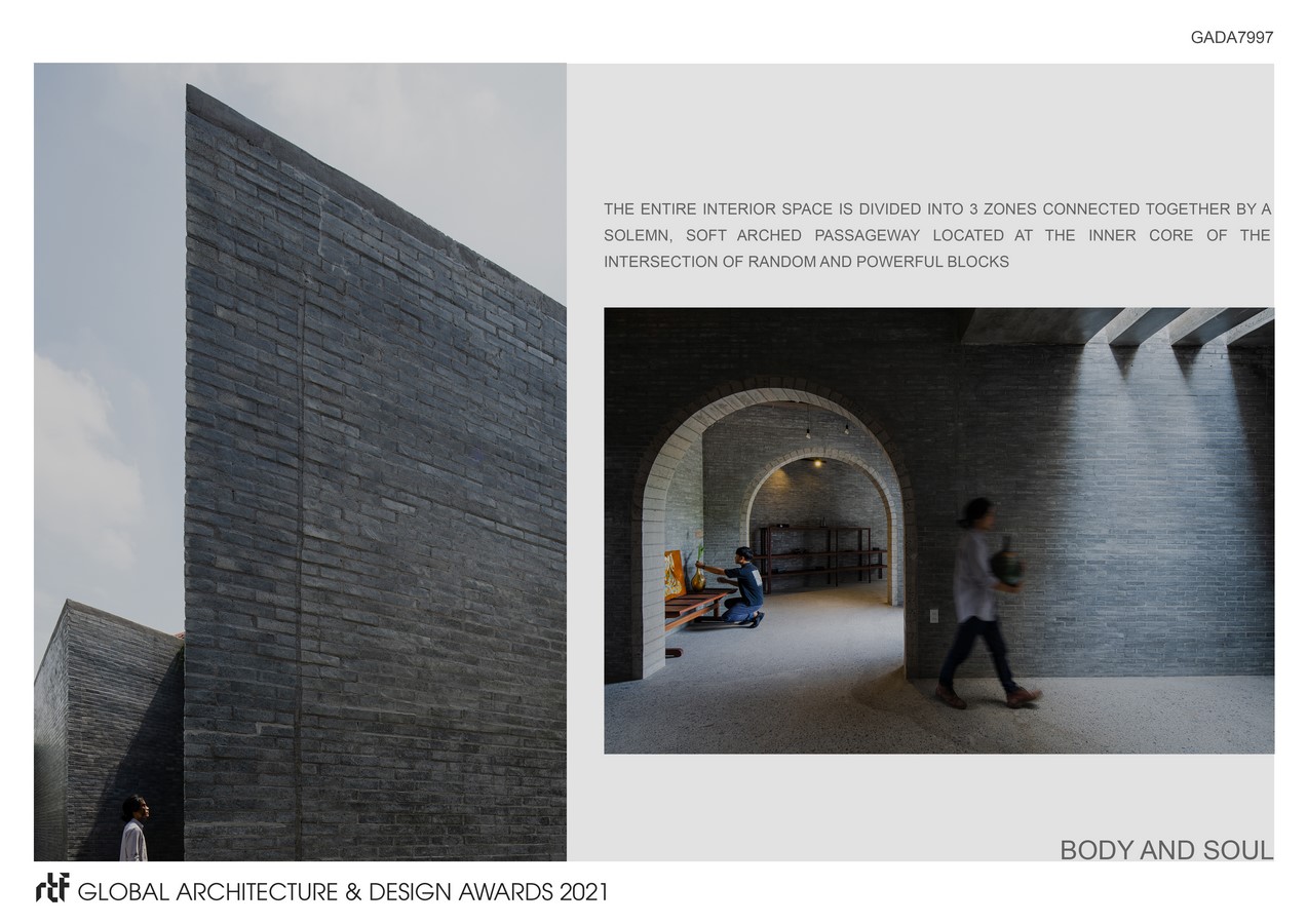 The entire interior space is divided into 3 zones connected together by a solemn, soft arched passageway located at the inner core of the intersection of random and powerful blocks.