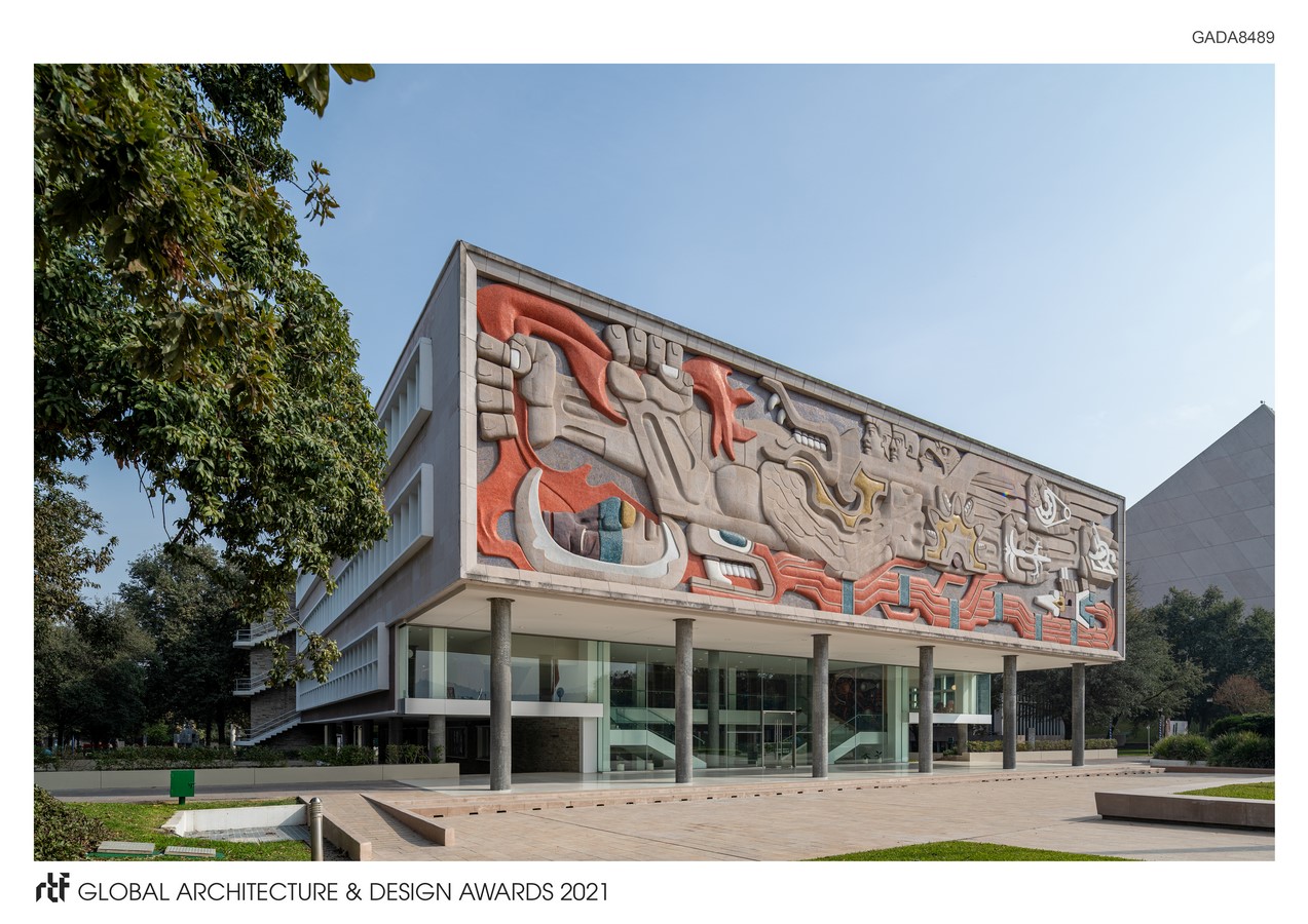 The building is defined by a mural by González Camarena that represents the battle between innovation and lack of purpose. Science is represented in the upper register, while the snakes and dark warriors occupying the lower register represent dark forces that will be conquered by innovation and technology.