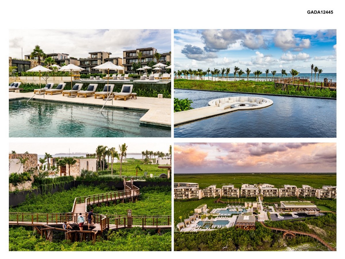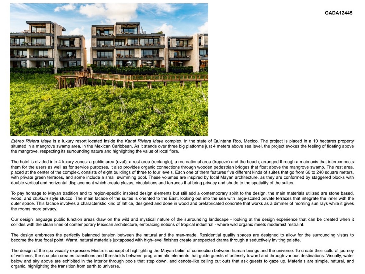 Etéreo Riviera Maya is a luxury resort located inside the Kanai Riviera Maya complex, in the state of Quintana Roo, Mexico. The project is placed in a 10 hectares property situated in a mangrove swamp area, in the Mexican Caribbean. As it stands over three big platforms just 4 meters above sea level, the project evokes the feeling of floating above the mangrove, respecting its surrounding nature and highlighting the value of local flora.