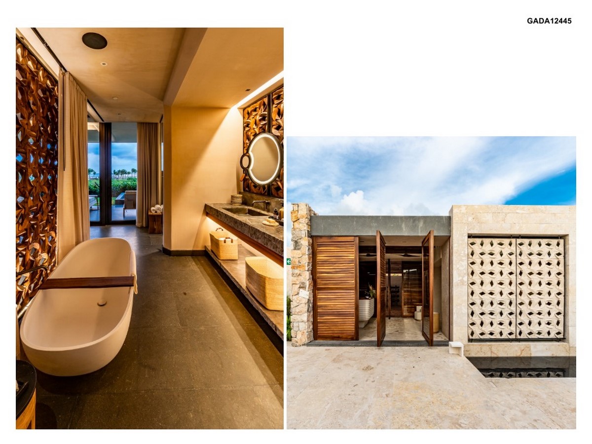 To pay homage to Mayan tradition and to region-specific inspired design elements but still add a contemporary spirit to the design, the main materials utilized are stone based, wood, and chukum style stucco. The main facade of the suites is oriented to the East, looking out into the sea with large-scaled private terraces that integrate the inner with the outer space. This facade involves a characteristic kind of lattice, designed and done in wood and prefabricated concrete that works as a dimmer of morning sun rays while it gives the rooms more privacy.