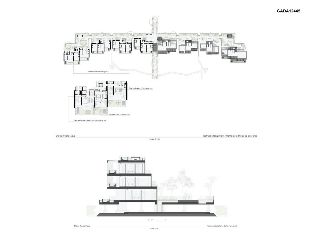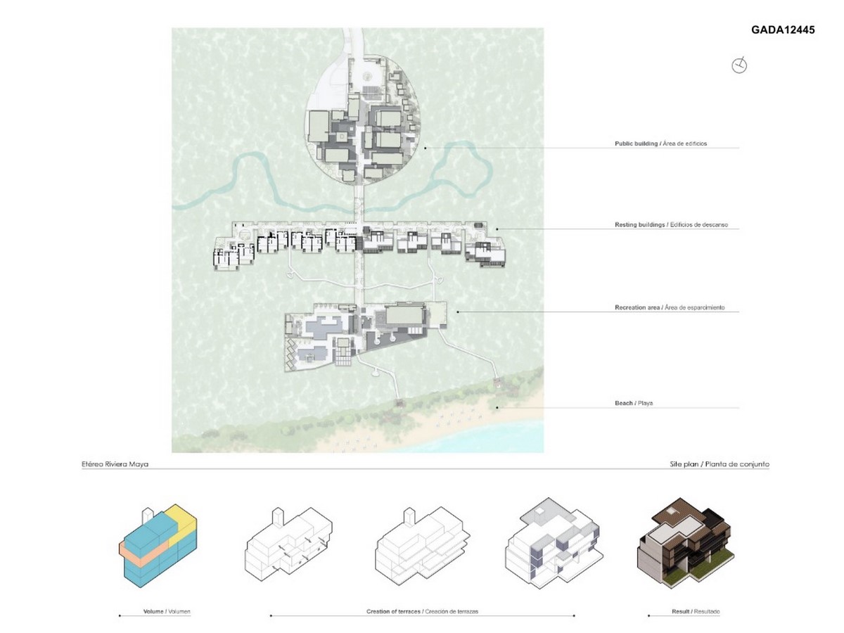 The hotel is divided into 4 luxury zones: a public area (oval), a rest area (rectangle), a recreational area (trapeze) and the beach, arranged through a main axis that interconnects them for the users as well as for service purposes, it also provides organic connections through wooden pedestrian bridges that float above the mangrove swamp. The rest area, placed at the center of the complex, consists of eight buildings of three to four levels. Each one of them features five different kinds of suites that go from 60 to 240 square meters, with private green terraces, and some include a small swimming pool. These volumes are inspired by local Mayan architecture, as they are conformed by staggered blocks with double vertical and horizontal displacement which create plazas, circulations and terraces that bring privacy and shade to the spatiality of the suites.