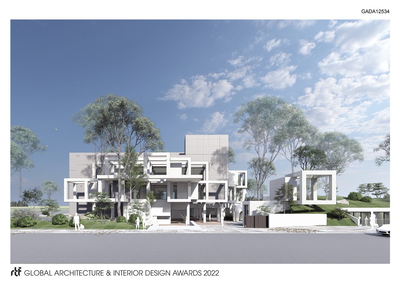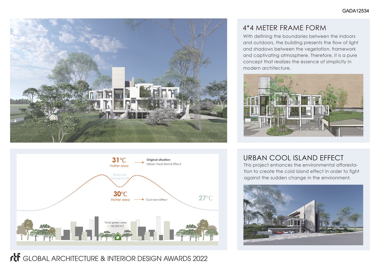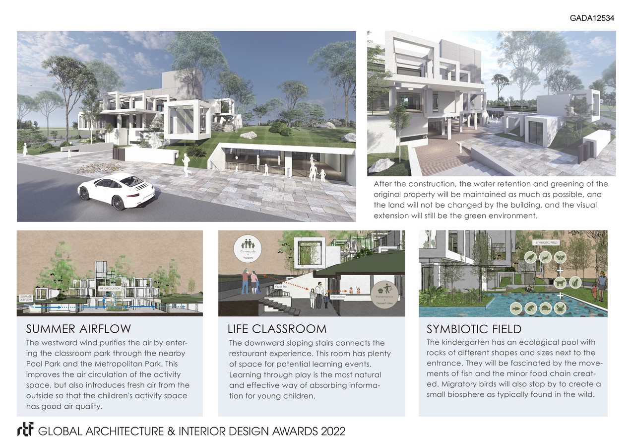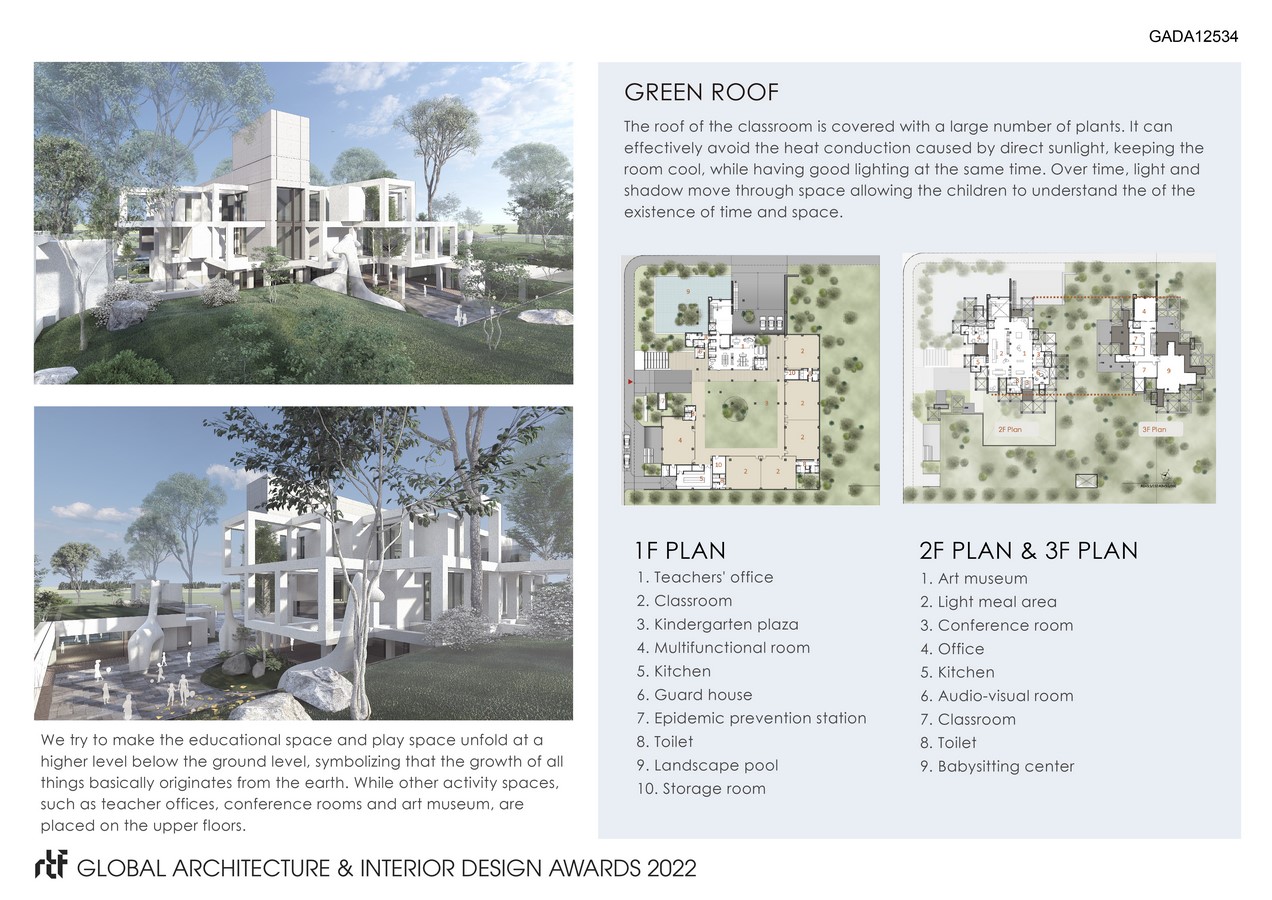 We try to make the educational space and play space unfold at a higher level below the ground level, symbolizing that the growth of all things basically originates from the earth. While other activity spaces, such as teacher offices, conference rooms and art museum, are placed on the upper floors. The buildings can be freely extended upwards like plants, and the architectural space on the higher floors is only defined by glass because of the integration of the natural environment. The roof of the classroom is covered with many plants. It can effectively avoid the heat conduction caused by direct sunlight, keeping the room cool, while having good lighting at the same time.
