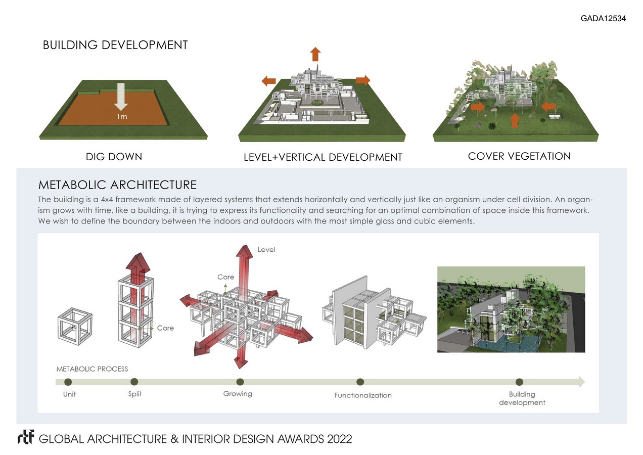 This is a metabolic growth with time the building is a 4×4 framework made of layered systems that extend horizontally and vertically like an organism under cell division. Searching for an optimal combination of space inside this framework. Wish to define the boundary between indoors and outdoors with the most simple glass and cubic elements.