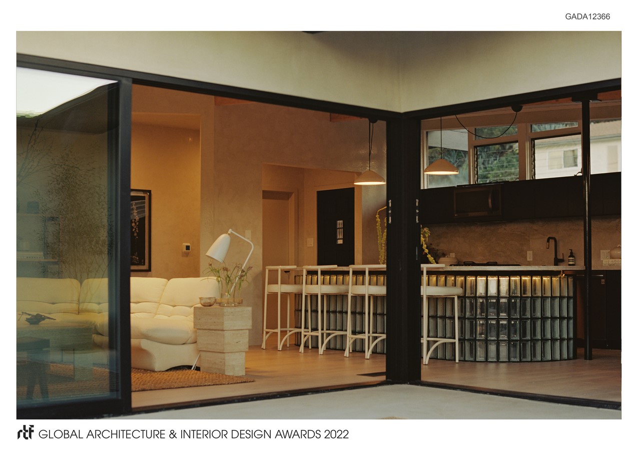 The firm implemented an open plan that uses subtle techniques to demarcate space: steps between rooms, symbolic textural differences, and plays on transparency that mimics separation without interrupting the lines of space. The design is action-oriented, creating flow while making the dweller aware of changes in space. Similarly, the designers playfully integrated glass privacy blocks – a mid-century modern design element often misassigned to a period of garish flash in the 80s. The architects found that the material not only possesses structural integrity but allows for the transfer of light, creating privacy while promoting flow. OWIU uses the blocks for a wall between the bathroom and main living area as well as the bean-shaped kitchen counter, allowing the fixture to seemingly float.