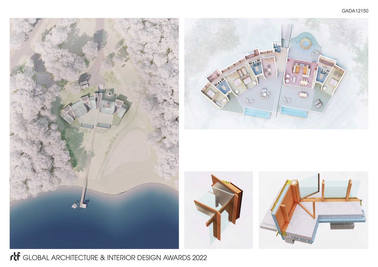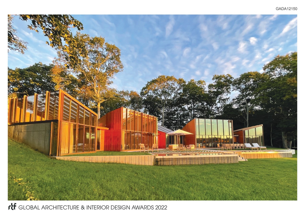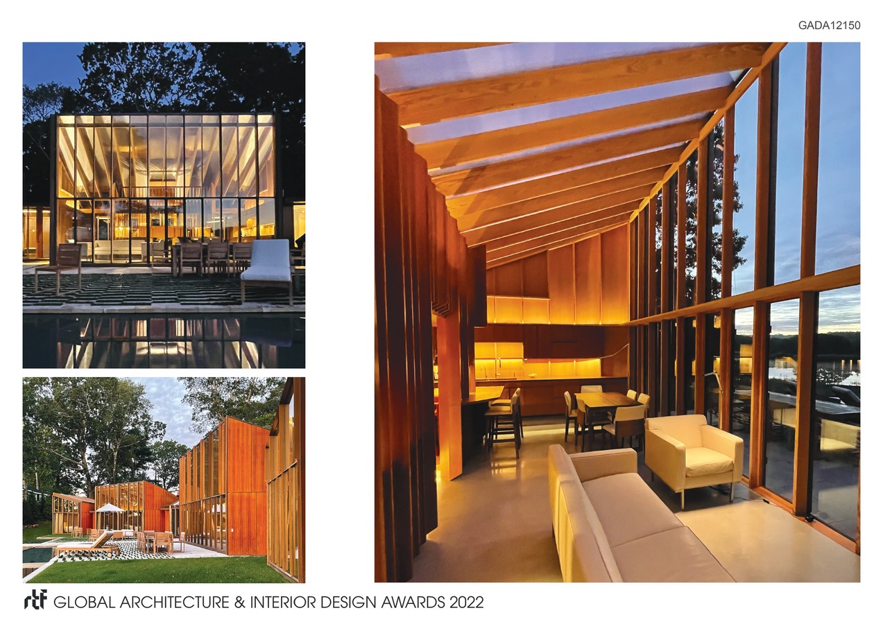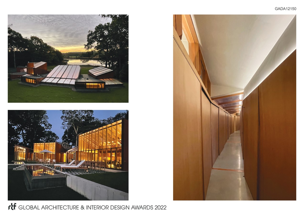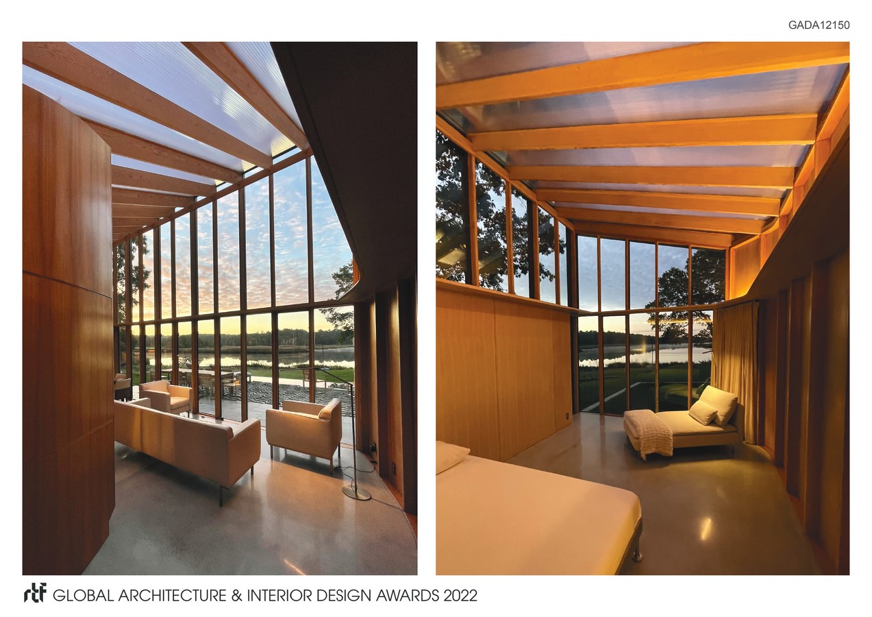 The River House, a fossil-fuel-free structure, sits on 1.1 acres on the banks of the Westport River in Massachusetts, commanding sweeping views to the south. The home’s solar crescent form allows for daylight to flood the interior. The house contains five bedrooms and accommodates large family conclaves with all interior surfaces like a fine cabinet, surrounding the occupants with rich, warm wood surfaces. The living spaces are framed by two-story-high glass enclosures opening to the sky to take advantage of the views and the horizon, creating a luminous living environment allowing for total immersion into the landscape, waterscape, and atmosphere.