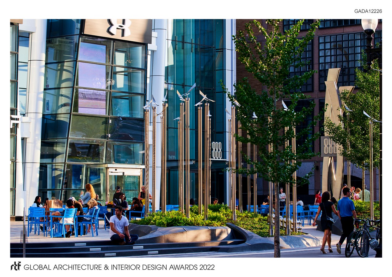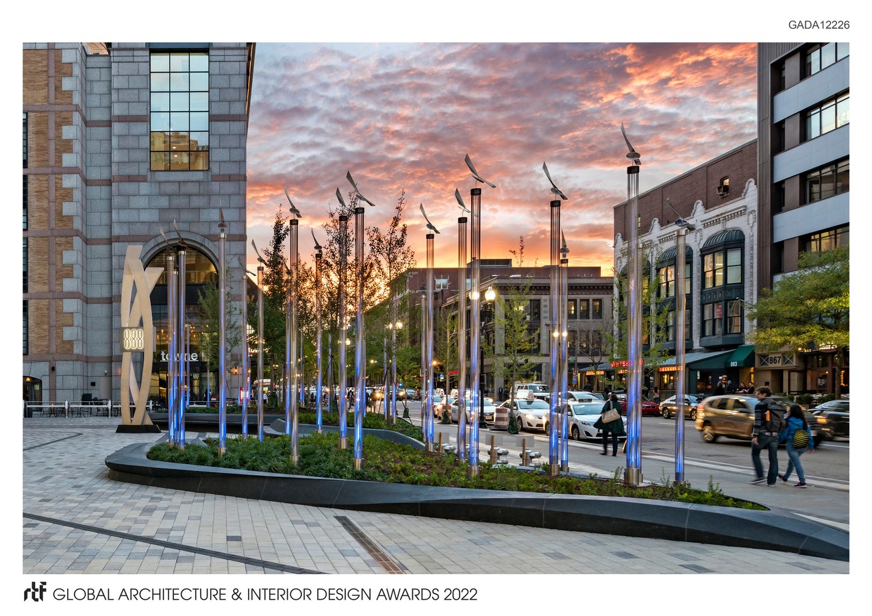 Together these light vanes transform this important urban plaza into a living wind diagram. The plaza provides a unique character to the Prudential retail complex, and has quickly become an epicenter for civic events, dining, and public performances. Designed in conjunction with the new LEED Platinum 17-story 888 Boylston Street building, this plazaโs integrated landscape systems utilize clean energy and irrigation water collected on the siteโs green roofs, rain gardens, wind turbines and solar panelsโsetting the stage for the most sustainable office building in New England.