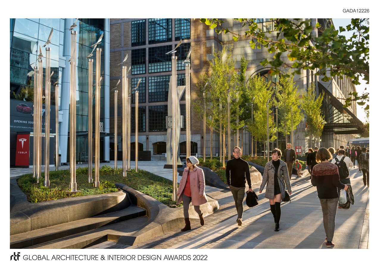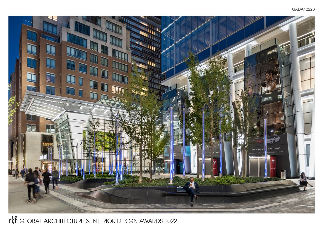 Designed to be one of the most sustainable and resilient commercial spaces in Boston, the Prudential Exchange offers Back Bay Boston a civic space that integrates stormwater and solar collection into a cohesive system that links the interior spaces with the landscape.ย The main entry plaza is inspired by the siteโs wind patterns and is highlighted with an innovative landscape that includes โwind-sweptโ carved granite planters and a grove of forty-four color-changing steel light columns, each capped with a sculptural wind vane.