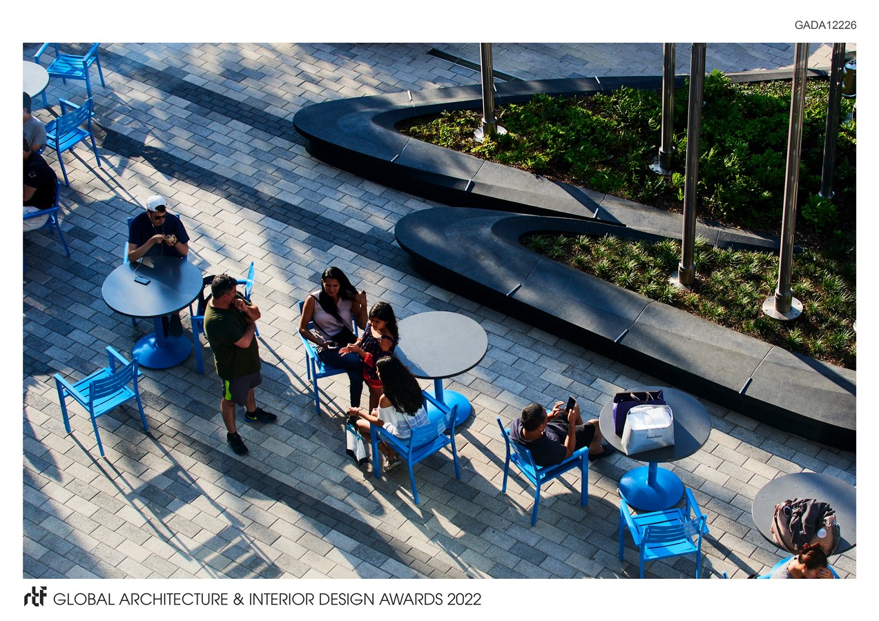 Each of the forty-four light columns are custom fabricated using a single metal strand that wraps around structural rods to create a delicate spiral translucent screen that is densely wound at the base and gradually opens towards the sky. The wind vanes work together with LED lights to transform the plaza into a living wind map. These reflective light poles also assist in wayfinding, ensuring 24-hour lighting to the highly trafficked entrance, and offer unique placemaking potential by engaging visitors with color, movement, and local weather information.