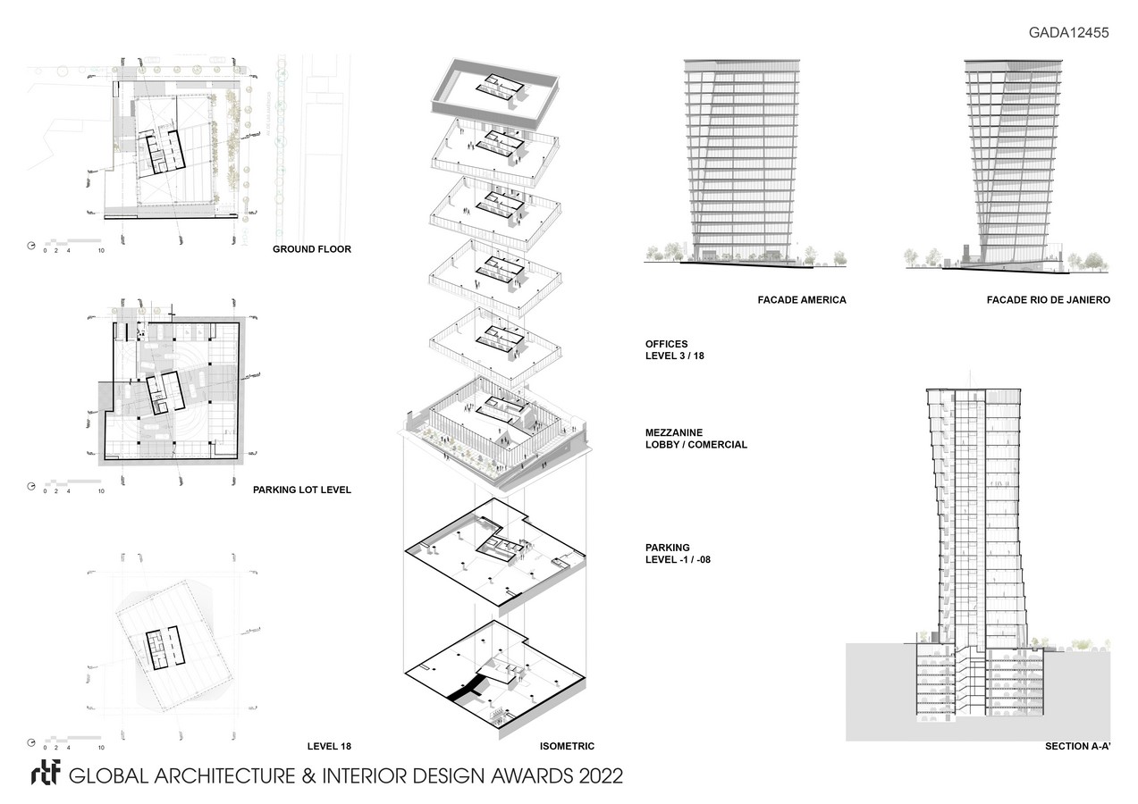The volume is made up of an off-center structural communications core, placed on the south façade that allows the habitable office area to be oriented towards the north and to the views of the Country Club, leaving the emergency stairs in the thermal zone with the highest solar incidence. Added to this, the torsion of the volume given by the 1.5° turn of each floor with respect to the previous one, which gives a 28° phase shift between the ground floor and the roof floor, makes the structural behavior more rigid and comfortable. better in an earthquake.