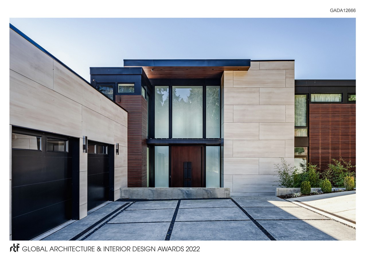 Situated at the edge of Lake Washington, the three-level residential abode serves as a haven of respite for a family of four and nestles away from the city buzz and embraces the calm of the surrounding nature. Cladded in IPE wooden slats, slab porcelain tiles and frosted glass, the vertical mass housing the entry renders a lantern effect while offer privacy from the elevated street. Grand, solid wood double doors use customized handles that are designed with the client’s family name, dotting the entrance of the house. Series of concrete slab stepstones float their way towards the entrance foyer in a levitating fashion above the river rock gravel, symbolizing the element of water in the Japanese Zen Garden. The gravel further continues underneath the bridge that connects the garage to the house. Alongside juxtaposing the bridge, Zen Garden punctuates a space of solitude, offering residents a space where they can take a moment to pause and separate themselves from the outside world.