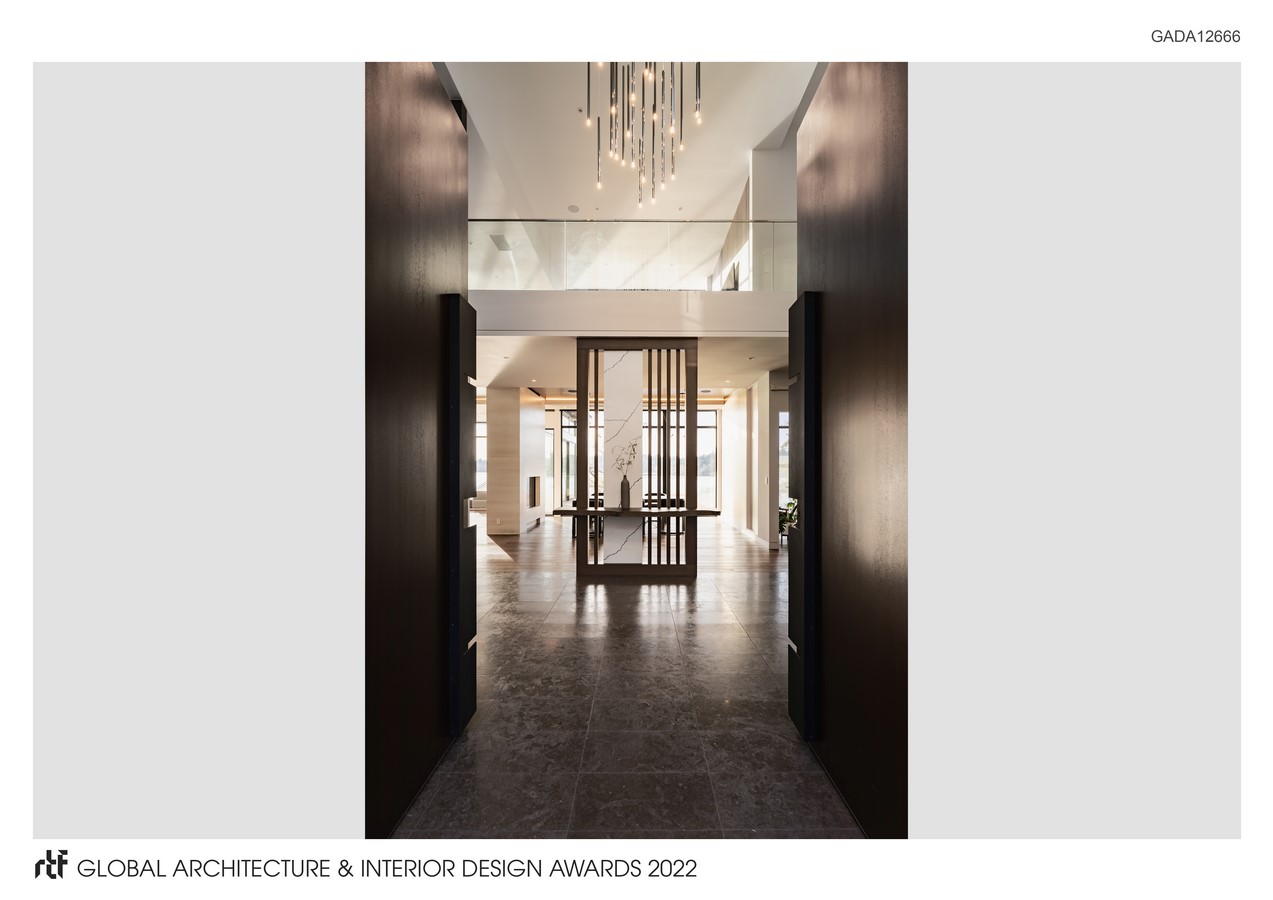 Upon entering the house, a floor to ceiling wooden slat and marble screen sits at the edge of the ย foyer atrium, acting as a focal point while offering a curious glimpse into the house and building anticipation as it shields just enough of the living spaces and surrounding views. Resplendent with a neutral material palette, the abode opens up to panoramic views of the lakefront.