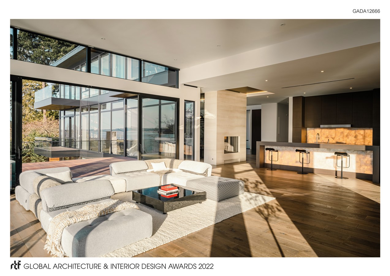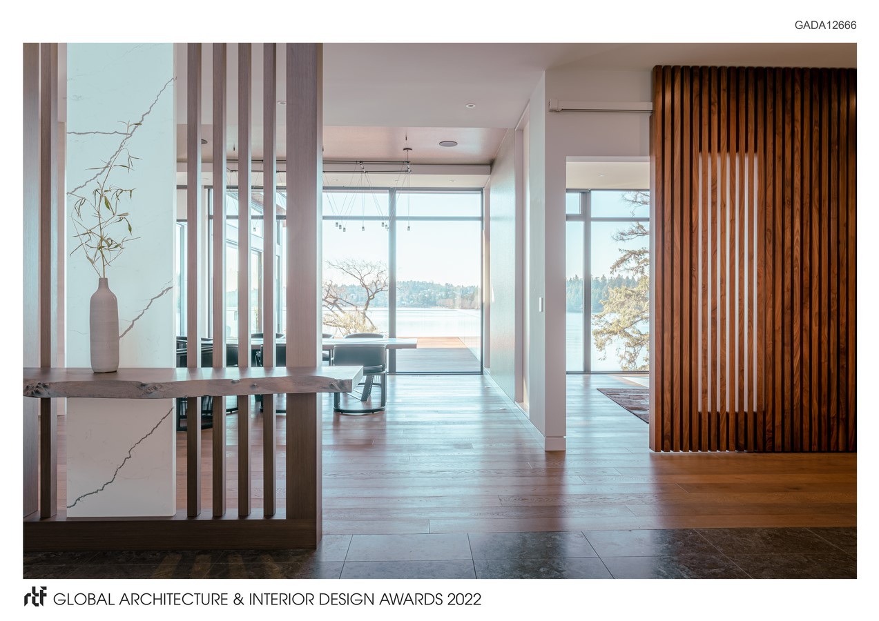Situated at the edge of Lake Washington, the three-level residential abode serves as a haven of respite for a family of four and nestles away from the city buzz and embraces the calm of the surrounding nature. Cladded in IPE wooden slats, slab porcelain tiles and frosted glass, the vertical mass housing the entry renders a lantern effect while offer privacy from the elevated street. Grand, solid wood double doors use customized handles that are designed with the clientโs family name, dotting the entrance of the house.ย Series of concrete slab stepstones float their way towards the entrance foyer in a levitating fashion above the river rock gravel, symbolizing the element of water in the Japanese Zen Garden. The gravel further continues underneath the bridge that connects the garage to the house. Alongside juxtaposing the bridge, Zen Garden punctuates a space of solitude, offering residents a space where they can take a moment to pause and separate themselves from the outside world.
