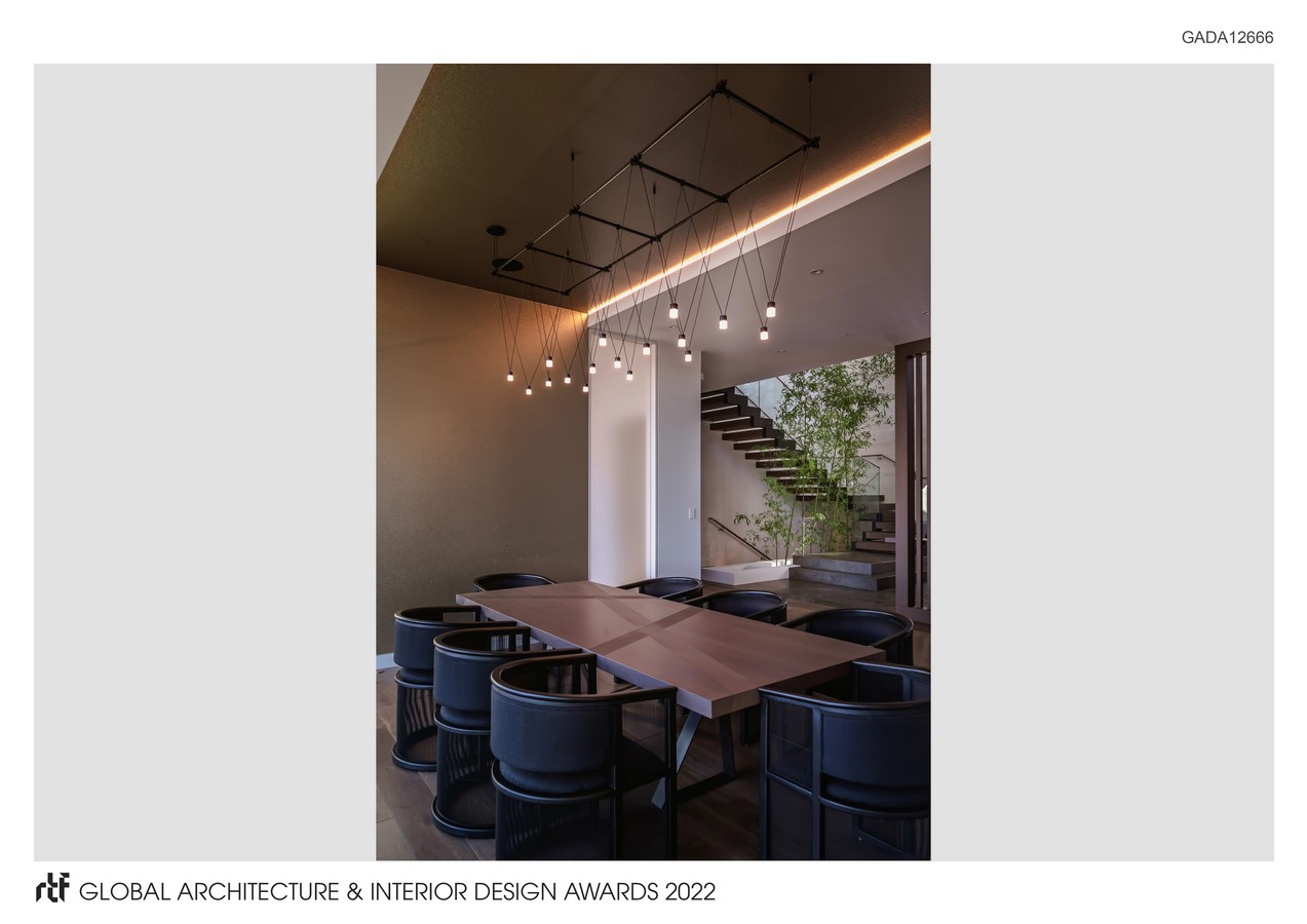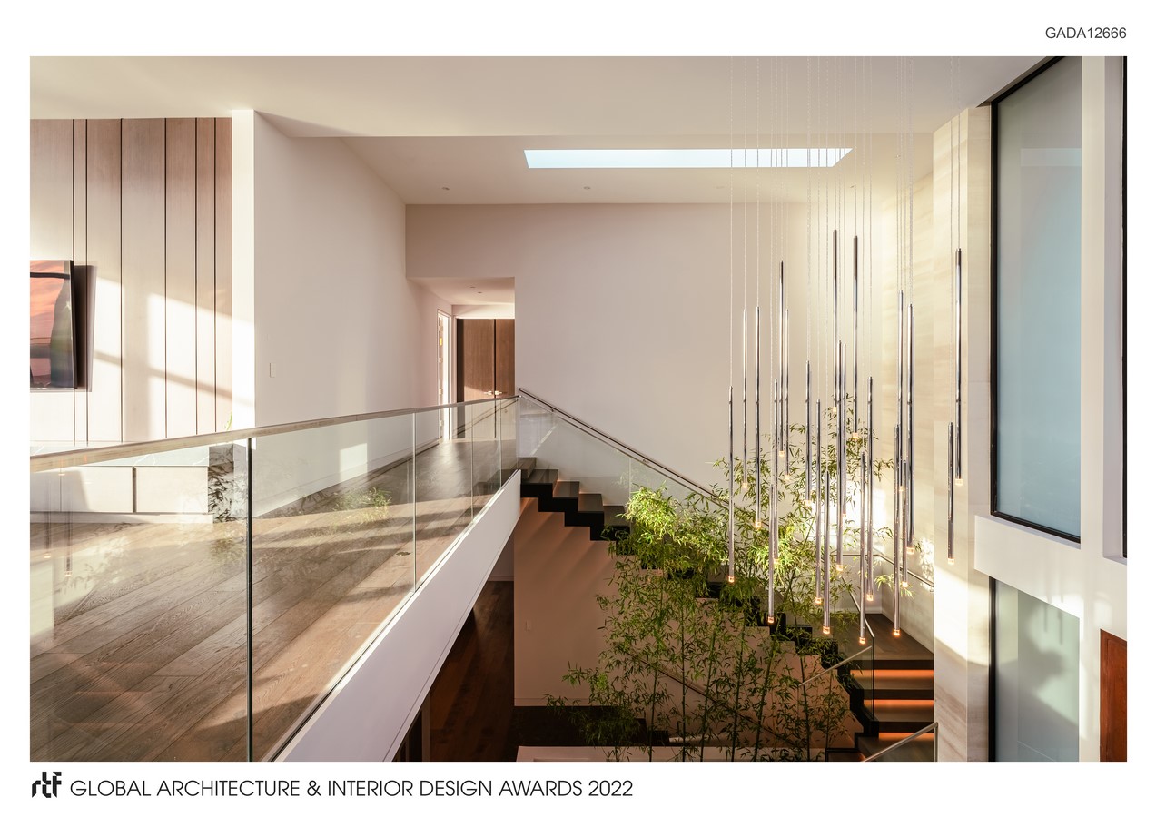 Inspired by the Chinese brush ink painting, the home serves as a blank canvas, layered in texture and experience, while allowing splashes of outdoor greens to add a wave of freshness. The look and feel of the space varies with the ever-changing seasons and time of the day. Extending from the exterior wrap are slab porcelain tiles that drape the interior walls, adjacent to the elegant open treads staircase. The tiles emulate the essence of water in stark contrast to the dark-toned wooden treads and bamboo plants emerging from the lower level, resonating with a mini Zen garden. Infused with dark-grained wood against light marble and pristine white walls, the residence radiates a serene and warm ambience.