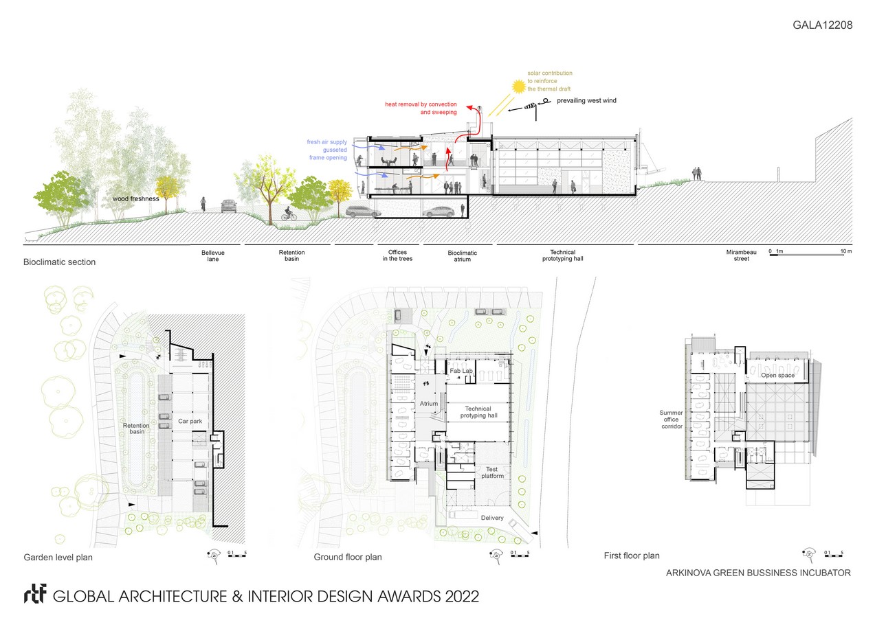 At the heart of the incubator, the bioclimatic atrium brings together these workspaces as a forum open to debates of ideas.