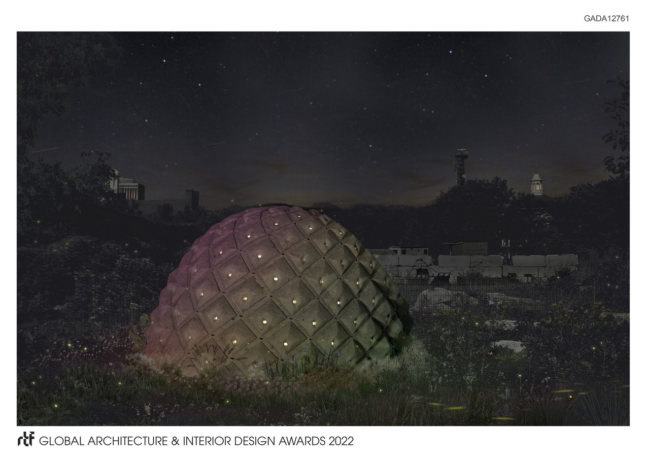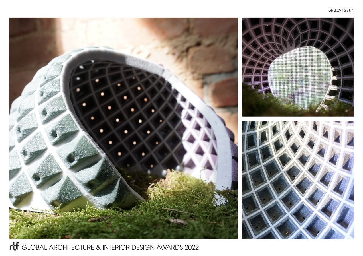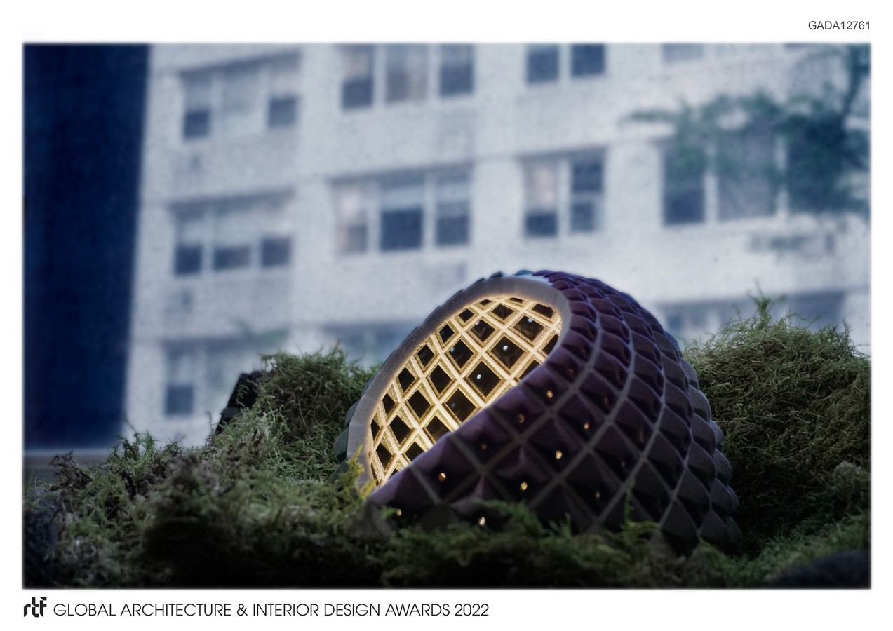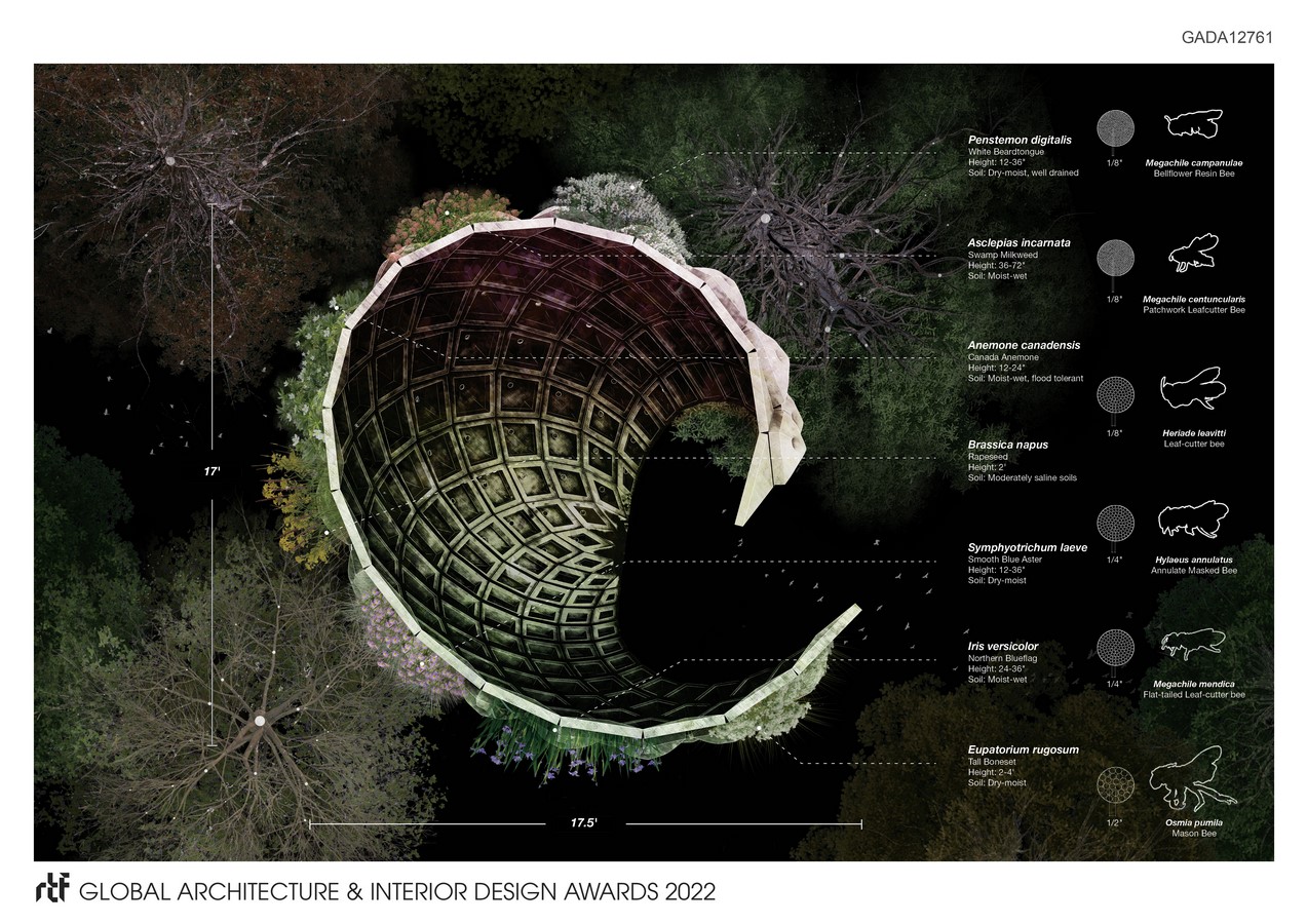 The diverse micro-conditions that we develop with our pavilion’s novel paneling system provide artificial nesting structures for solitary bees and models environmental stewardship in our Anthropocene age. Cited alongside The Bee Conservancy at Governors Island’s Urban Farm, the Hempcrete Habitat scaffolds biodiversity in providing a constructed habitat while simultaneously bringing visibility to these vital native pollinators. This prototype seeks to address the urban opportunity provided by NYC Department’s Local Laws 92 /94 of 2019, mandating “that all new buildings and alterations of existing buildings where the entire existing roof deck or roof assembly is being replaced must provide a sustainable roofing zone covering 100% of the roof,” a radically environmental vision for a present day scarred by mass extinction, climate urgency, pandemic and social crisis.