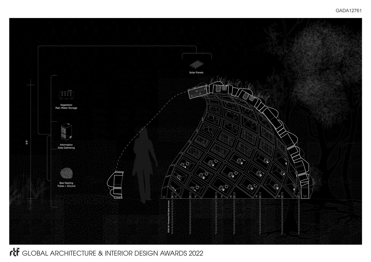 The Hempcrete Habitat proposes an analogous habitat, monitoring station, and visitors’ center on Governors Island. In section, the pavilion offers a vertical ecology with nesting tubes for bees at its lowest rungs, plants and water catchment above and finally solar panels at the top; this off- the-grid system powers the cameras and microprocessors that comprise the data-gathering components of the pavilion. Images of native bees harvested by the embedded cameras feed a database trained to automate insect identification with the support of Microsoft’s AI for Earth program.The pavilion’s hempcrete drawers are slotted within a wood scaffold and contain nesting tubes for solitary bees and a solar-powered Arduino-based monitoring platform.
