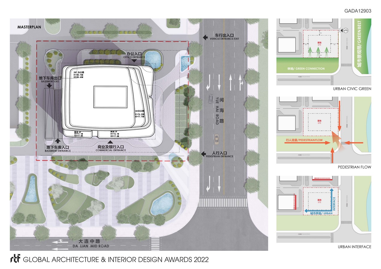 Jianfa HQ Tower is an oasitic expression in the heart of Yinchuan city, the capital of Ningxia province in North West of China. The 80m grade-A office tower sits in a prominent spot of the new Yuehai Lake CBD. The project occupies an important intersection between the CBD inner ring, Yuehai road, and the central boulevard, Dalian middle road, next to a landmark green belt.