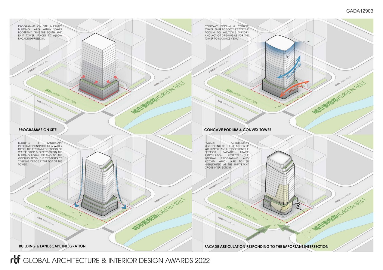 The design concept is derived from a dynamic motion of water droplet that symbolizes the ‘urban oasis’, which is an attribute to Yinchuan itself known as ‘Oasis in the Desert’. The restrained tension of the water drop is expressed on the building form, dissolving to the ground from the step-terrace style HQ office at the top of the tower. The design of the tower expresses an articulation and softness that is shown in the round corners that disappear into its surroundings. At lower level, the tower will aim to promote urban activity by offering retail opportunities. The retail steps down from the tower outline to the property edge, intending to form a water splash.