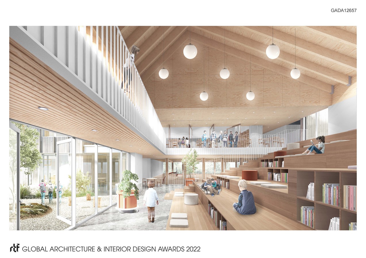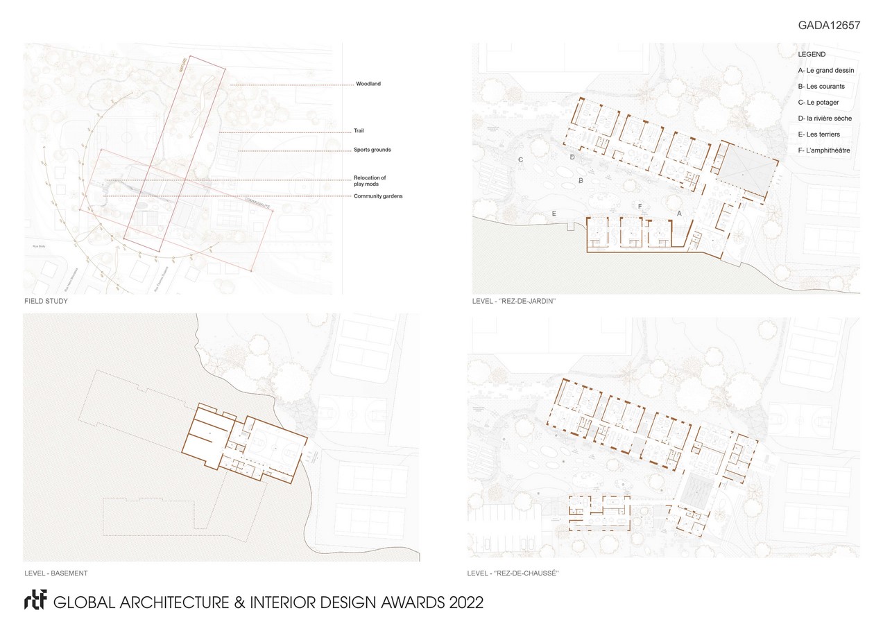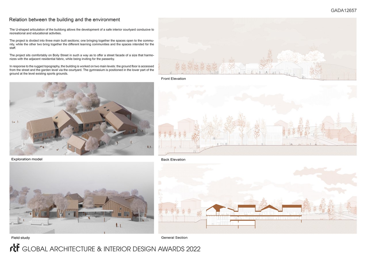 The building is divided into distinct houses, arranged around an outdoor courtyard, united by glass passages. The architectural design aimed to deconstruct the conventional school, a building with an institutional style, and transpose it onto a livable scale, accessible and warm for the child; to design a building on the scale of toddlers; to fragment a complex arrangement into a legible volume; to offer multiple reference points. The school’s characteristic pedagogical approach, described using the term “nurture”, coloured the project, lending it a reassuring and familiar architecture.