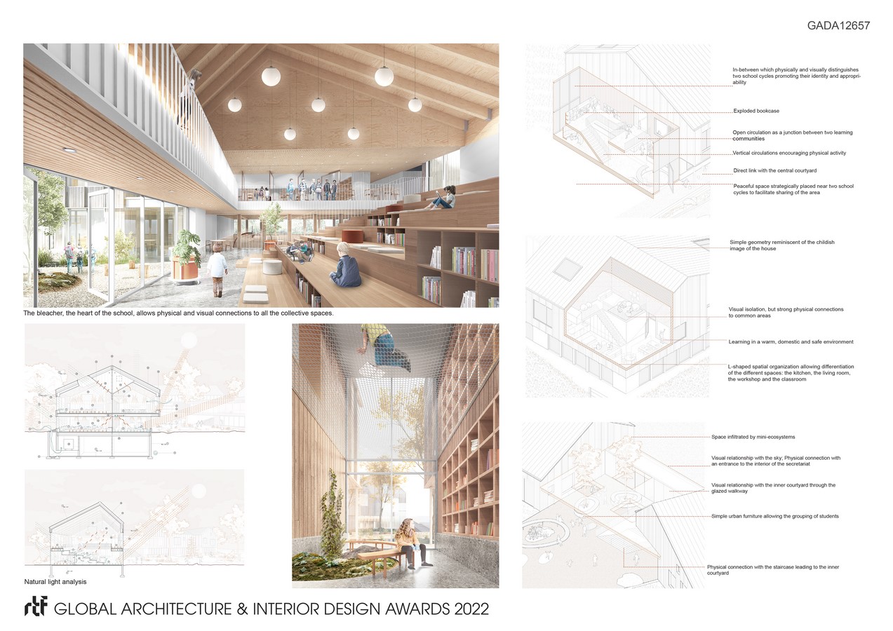The project is articulated across three main construction areas; one gathering the spaces open to the community, while the other two gather the different learning communities and staff areas. The street-facing wing is comprised, at the ground level, of the staff rooms that animate the façade, while beneath them, at the garden level, you can find the preschool classrooms. The kindergarten classes’ strategic location on the lower level allows for a strong connection with the courtyard, contributing to a feeling of safety. The central wing is more porous. It offers vast spaces representing the urban, dynamic, and effervescent core, encouraging students’ socialisation. The gymnasium is found at the intersection of both wings and in direct connection with the sports fields, facilitating the use of installations by the community. The stands, heart of the school, allow for physical and visual connections with all the shared spaces. The third wing is subdivided into three houses, each one housing an elementary cycle. Each learning community is thus organised over two levels, creating a livable scale.