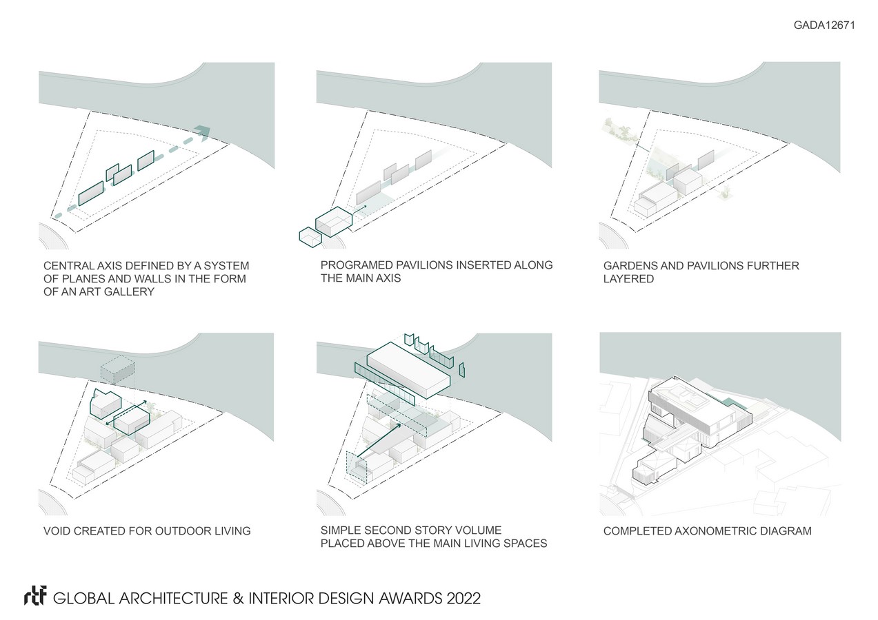 The design is certified LEED Gold, while carefully considers the desires and needs of three characters: nature, art and occupant, while retaining a respectful massing in context. Displaced pavilions are connected by a central art gallery aligned with the siteโs optimal view. In-between are programed gardens that integrate nature deep into the floor plan. The second level is an efficient multi-bedroom volume wrapped in an operable screen system. This screen provides ample privacy for the NE Faรงade, and critical solar shading for glazing on the SW faรงade, protecting both art and occupants from harmful UV light.