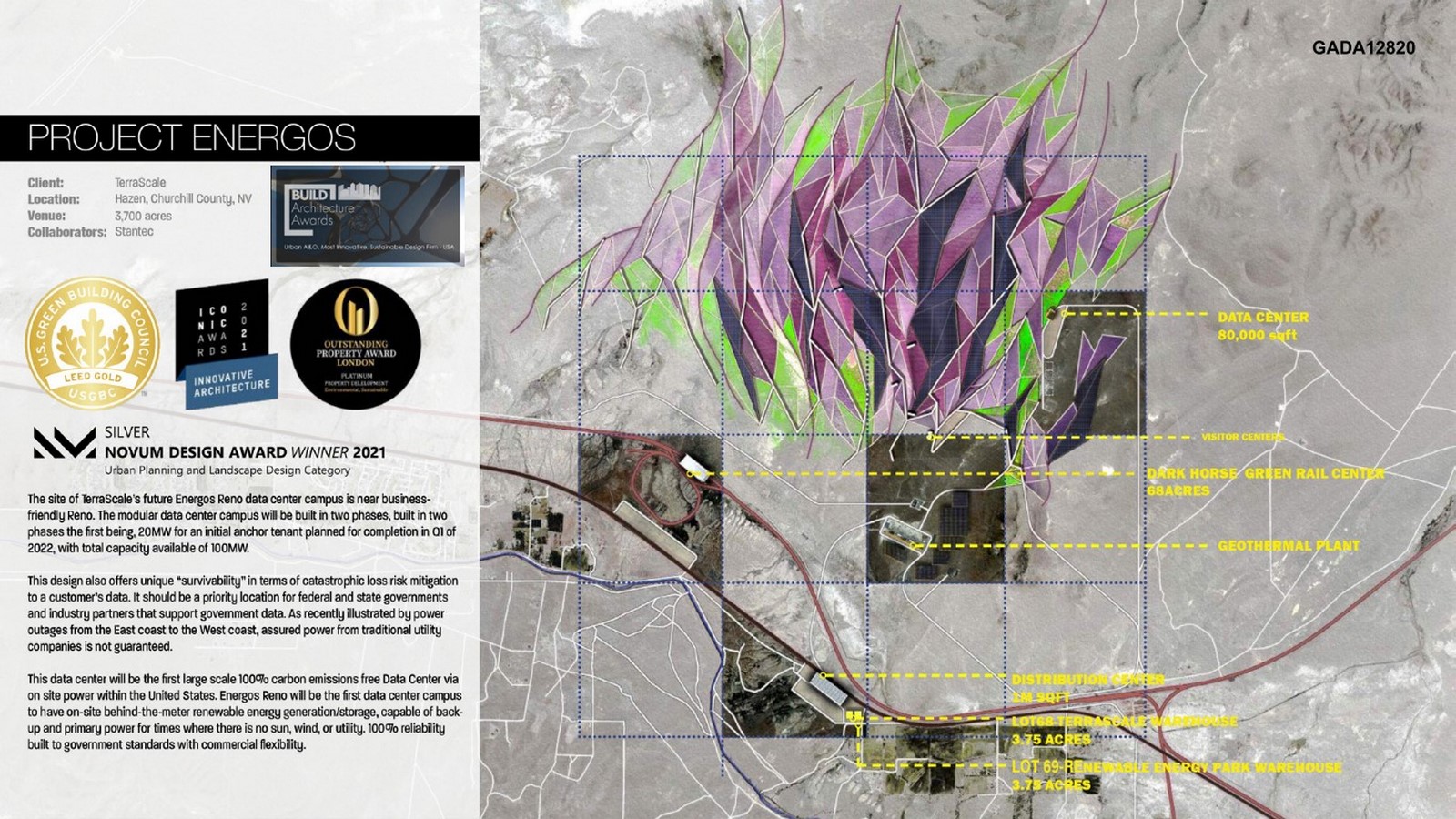 The project summary is as follows: It is currently a 20MW Data Center (expansion to 100MW) designed for an industrial campus, and it achieves Carbon Neutrality by combining hybrid power including a solar array of 100MW, a waste-water treatment plant, and a geothermal plant on site. Upon completion, it will be the largest green infrastructural development in the USA powered by hybrid energy.