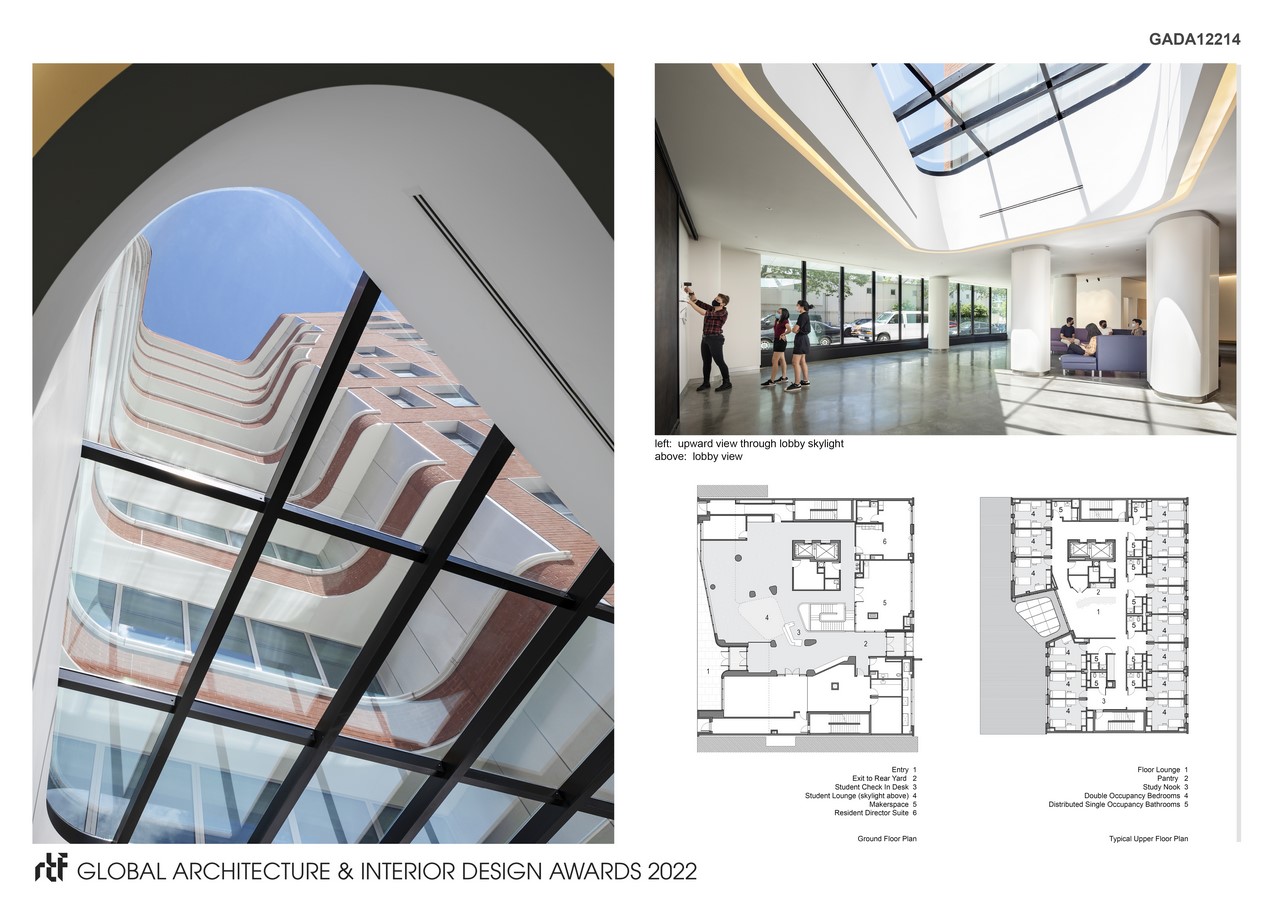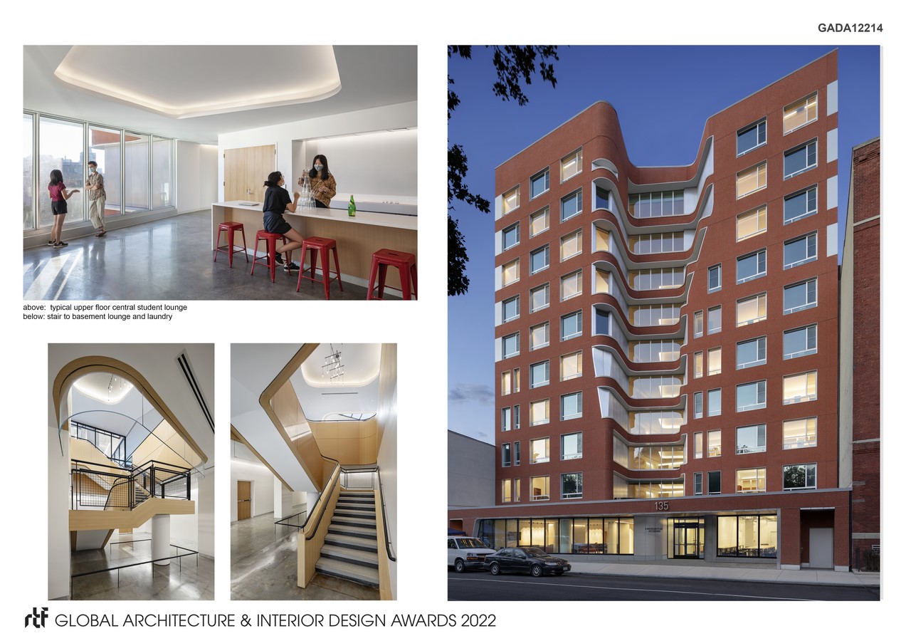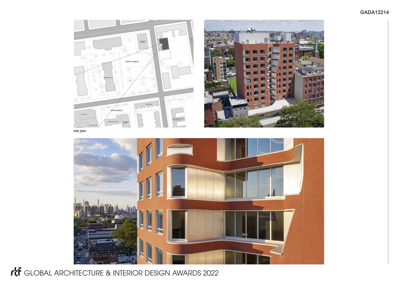 The building is located approximately one block from the main campus gate, embedded within the Clinton Hill neighborhood. The main floors are set back from the street with entry through a one-story podium. Within this podium students can use the central event space for social or study activities and the adjacent maker space which includes studio resources. Upper floors consist of 14 rooms for two students each. Shared, compartmentalized bathrooms are distributed throughout the floor. The central lounge on each floor has a work counter and furniture for community use. The exterior is composed primarily of brick with curved stainless steel panels. These materials are intended to engage the historic brick campus and neighborhood while setting apart the distinctive forms of the courtyard and lounge spaces.