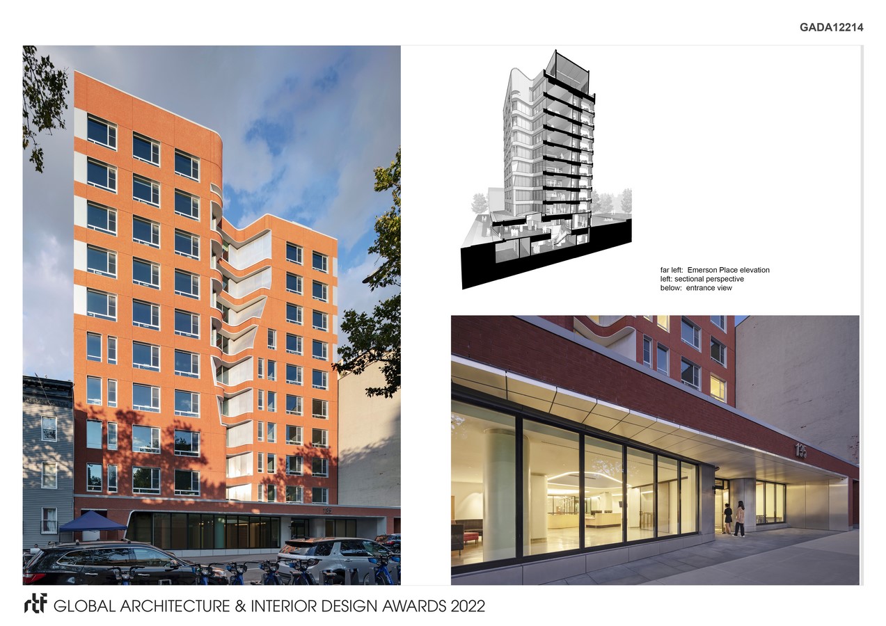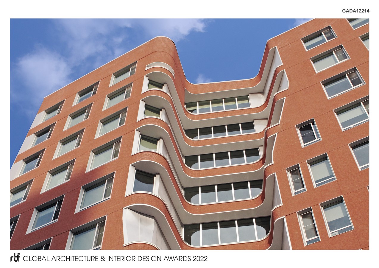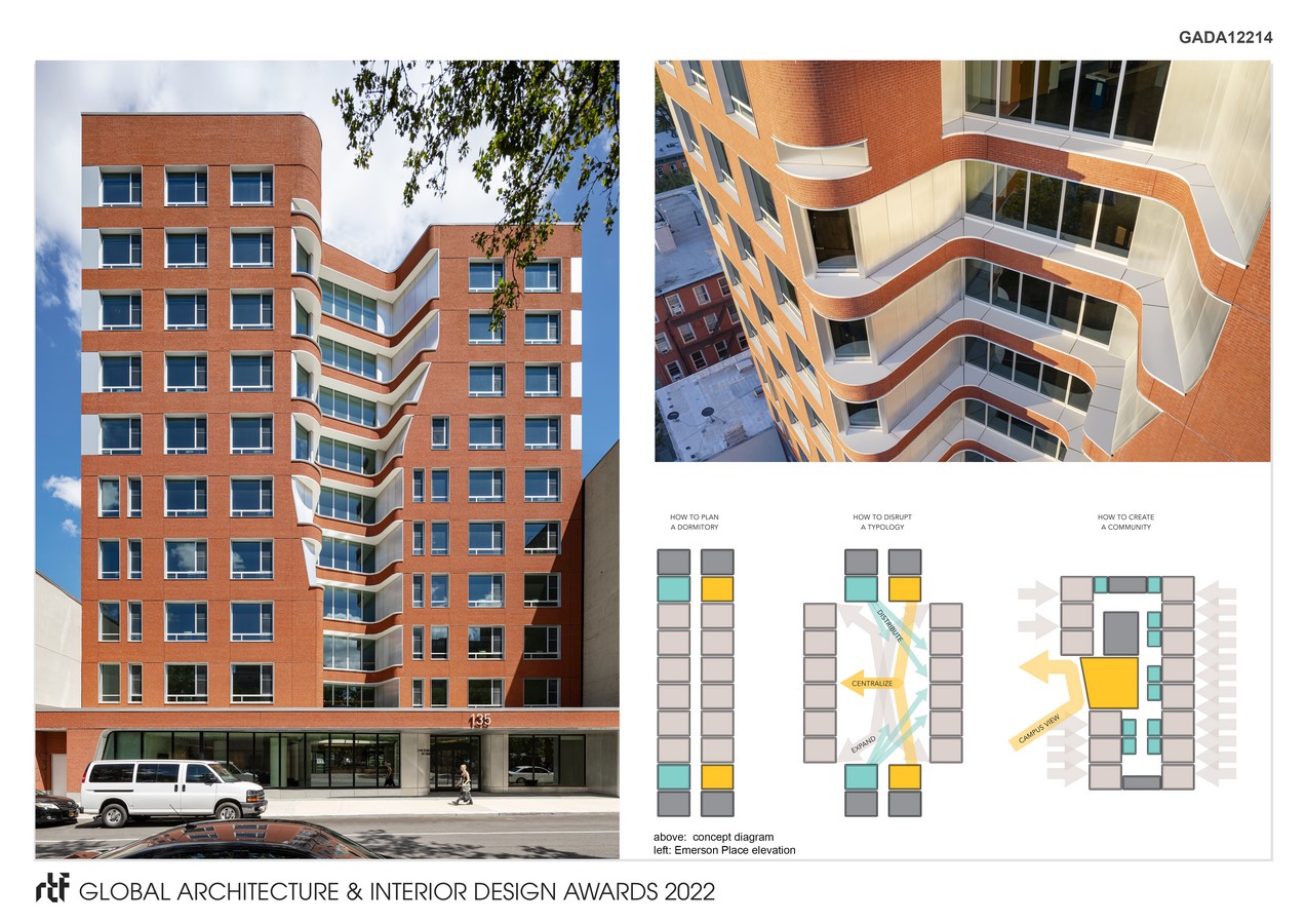 The building is located approximately one block from the main campus gate, embedded within the Clinton Hill neighborhood. The main floors are set back from the street with entry through a one-story podium. Within this podium students can use the central event space for social or study activities and the adjacent maker space which includes studio resources. Upper floors consist of 14 rooms for two students each. Shared, compartmentalized bathrooms are distributed throughout the floor. The central lounge on each floor has a work counter and furniture for community use. The exterior is composed primarily of brick with curved stainless steel panels. These materials are intended to engage the historic brick campus and neighborhood while setting apart the distinctive forms of the courtyard and lounge spaces.