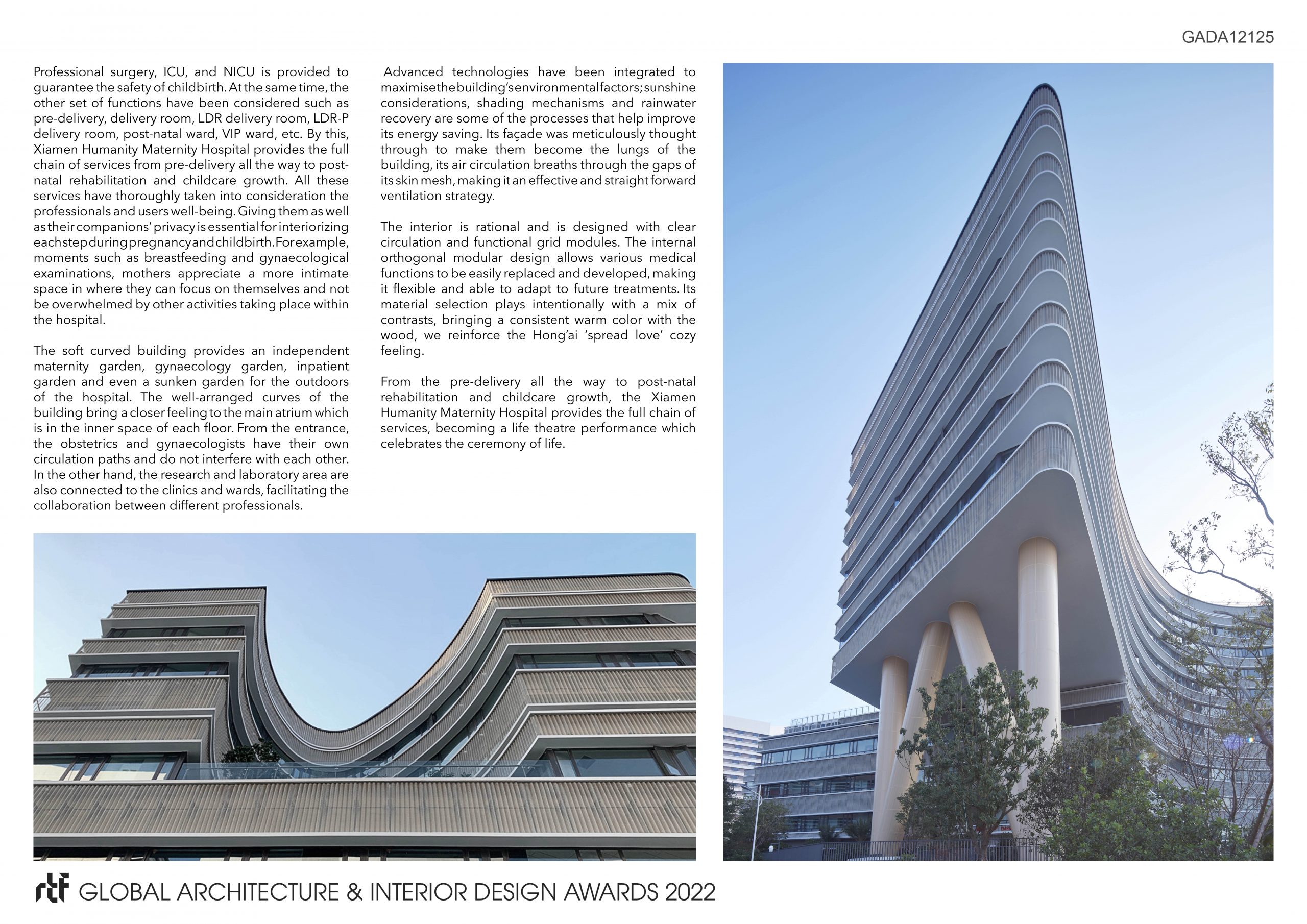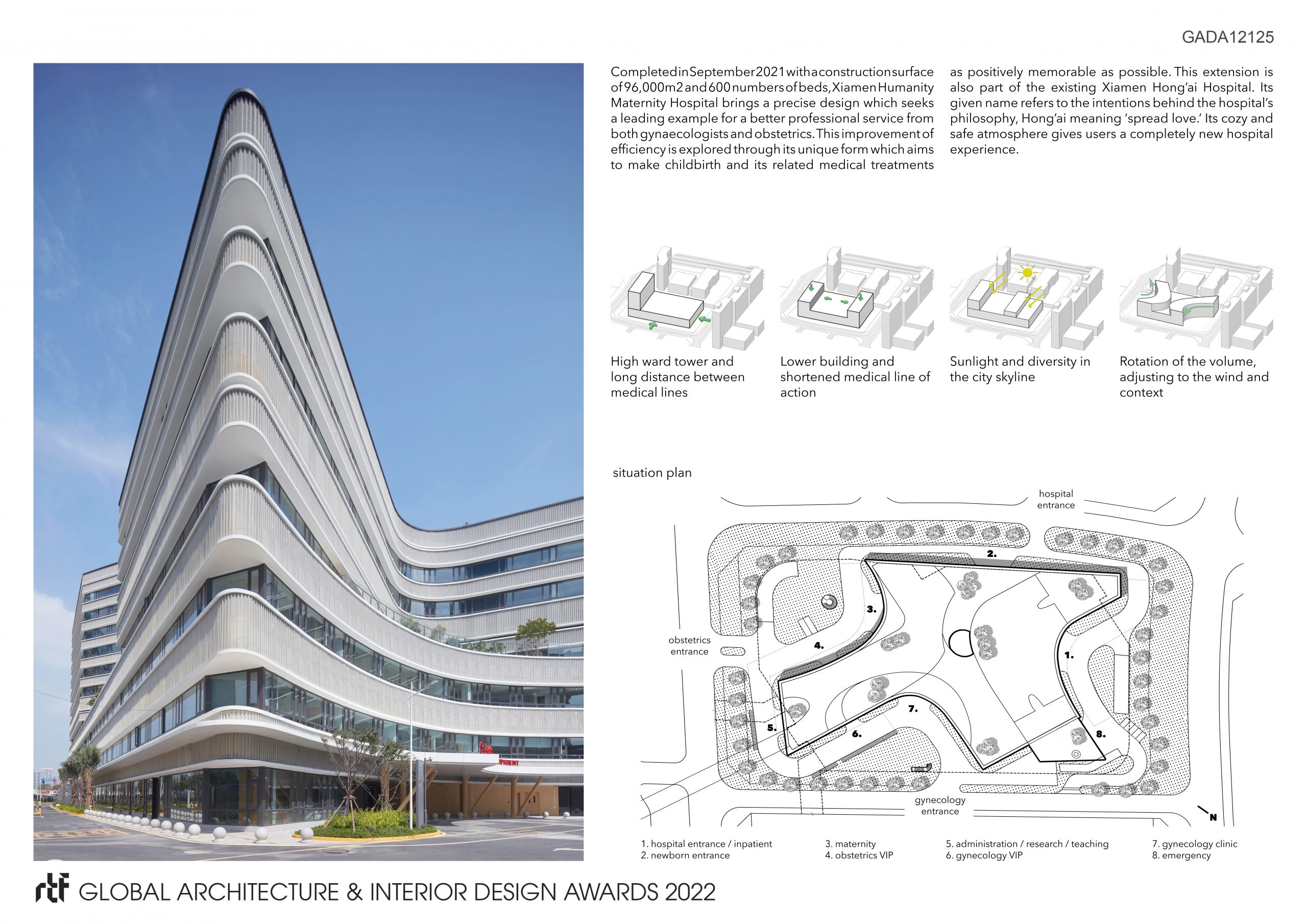 Completed in September 2021 with a construction surface of 96,000m2 and 600 numbers of beds, Xiamen Humanity Maternity Hospital brings a precise design which seeks a leading example for a better professional service from both gynaecologists and obstetrics. This improvement of efficiency is explored through its unique form which aims to make childbirth and its related medical treatments as positively memorable as possible.โฏThis extension is also part of the existing Xiamen Hong’ai Hospital. Its given name refers to the intentions behind the hospitalโs philosophy, Hongโai meaningย โspread love.โ Its cozy and safe atmosphere gives users a completely new hospital experience.